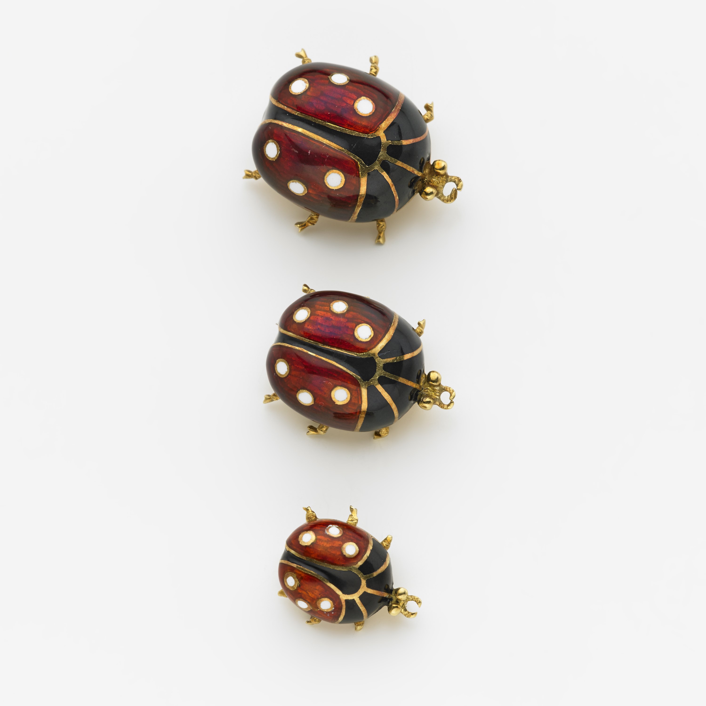 Tre spille a guisa di coccinelle scalate, "betes du bon dieu", in oro giallo e smalti, g. 23,70. Prov.: dono di Giambattista Marchese Guerrieri Gonzaga alla madre Emilia Marchesa Guerrieri Gonzaga, nata Vimercati Sanseverino, C.ssa di Palazzo Pignano Three degrading enamel and gold ladybird brooches Provenance: present from Giambattista Marquess Guerrieri Gonzaga to his mother Emilia Marchioness Guerrieri Gonzaga born Vimercati Sanseverino, Countess Palazzo Pignano