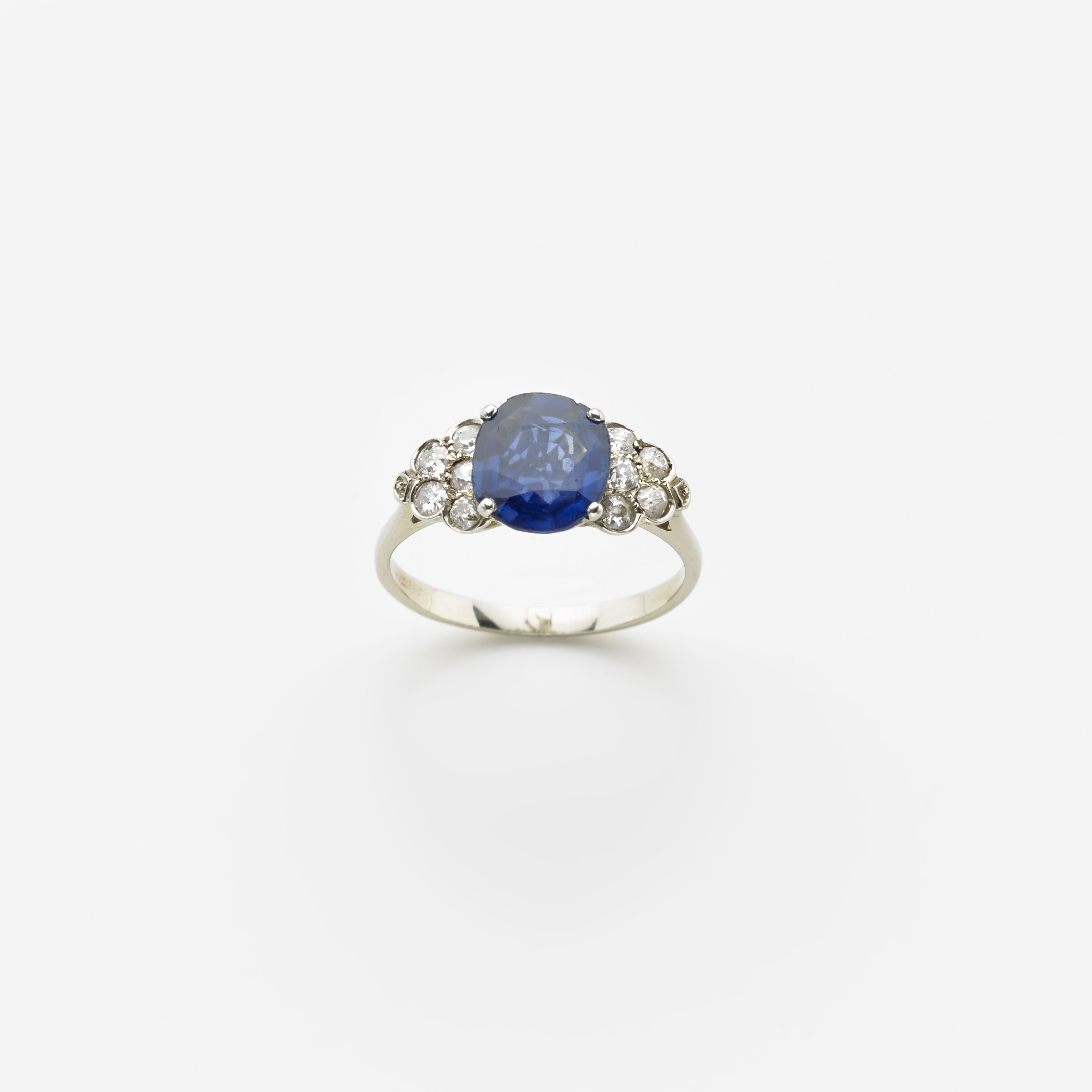 Anello in oro bianco,con zaffiro ovale, taglio composito, ct. 1,90 circa e 10 diamanti pi˘ piccoli. Prov.: nonna materna C.ssa Antonietta Caterina Vimercati Sanseverino nata Rossi Martini Sapphire single stone gold ring with diamond surround Prov: Grandmother of Countess Antonietta Caterina Vimercati Sanseverino born Rossi Martini