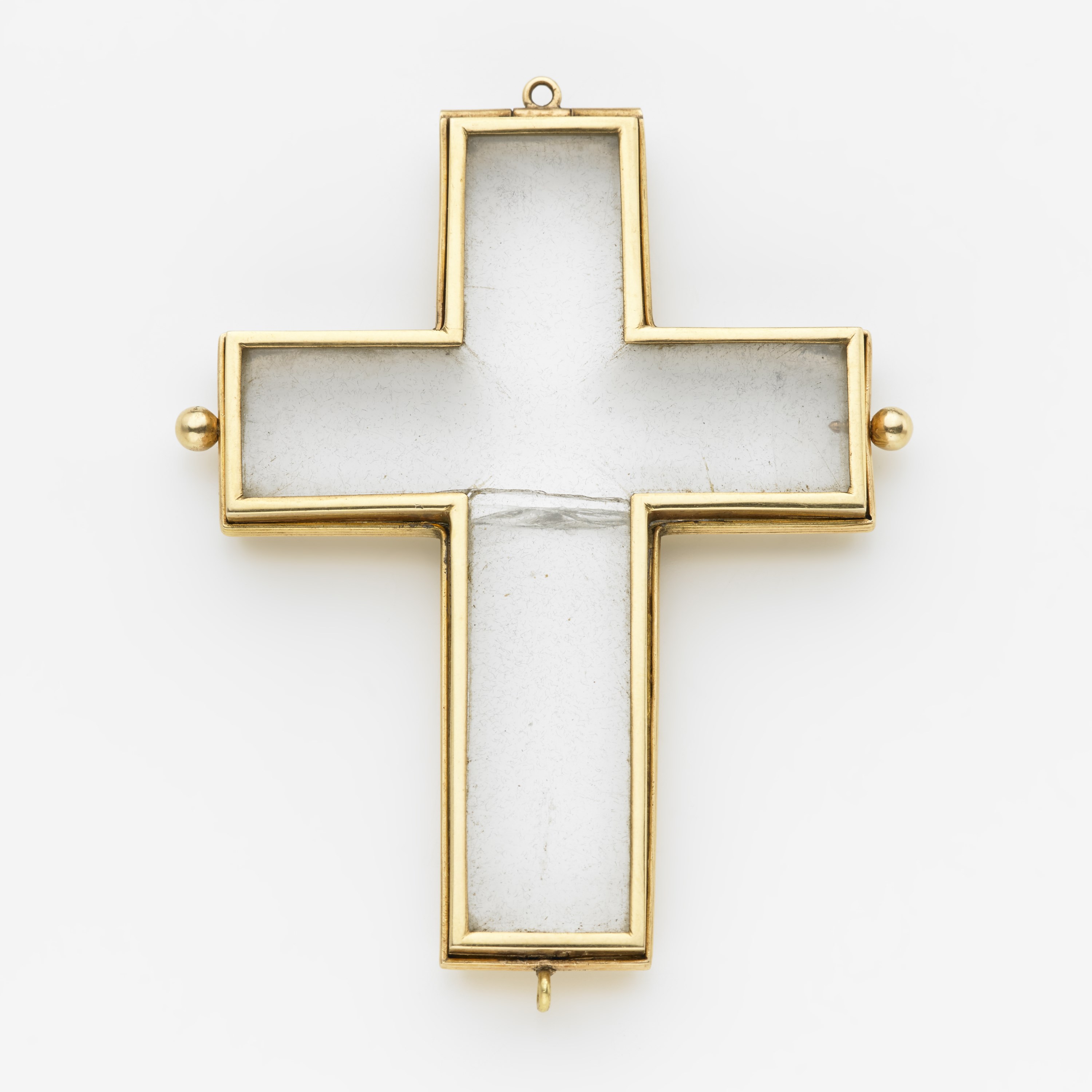Portareliquie a forma di croce in oro giallo e materiale trasparente, con...