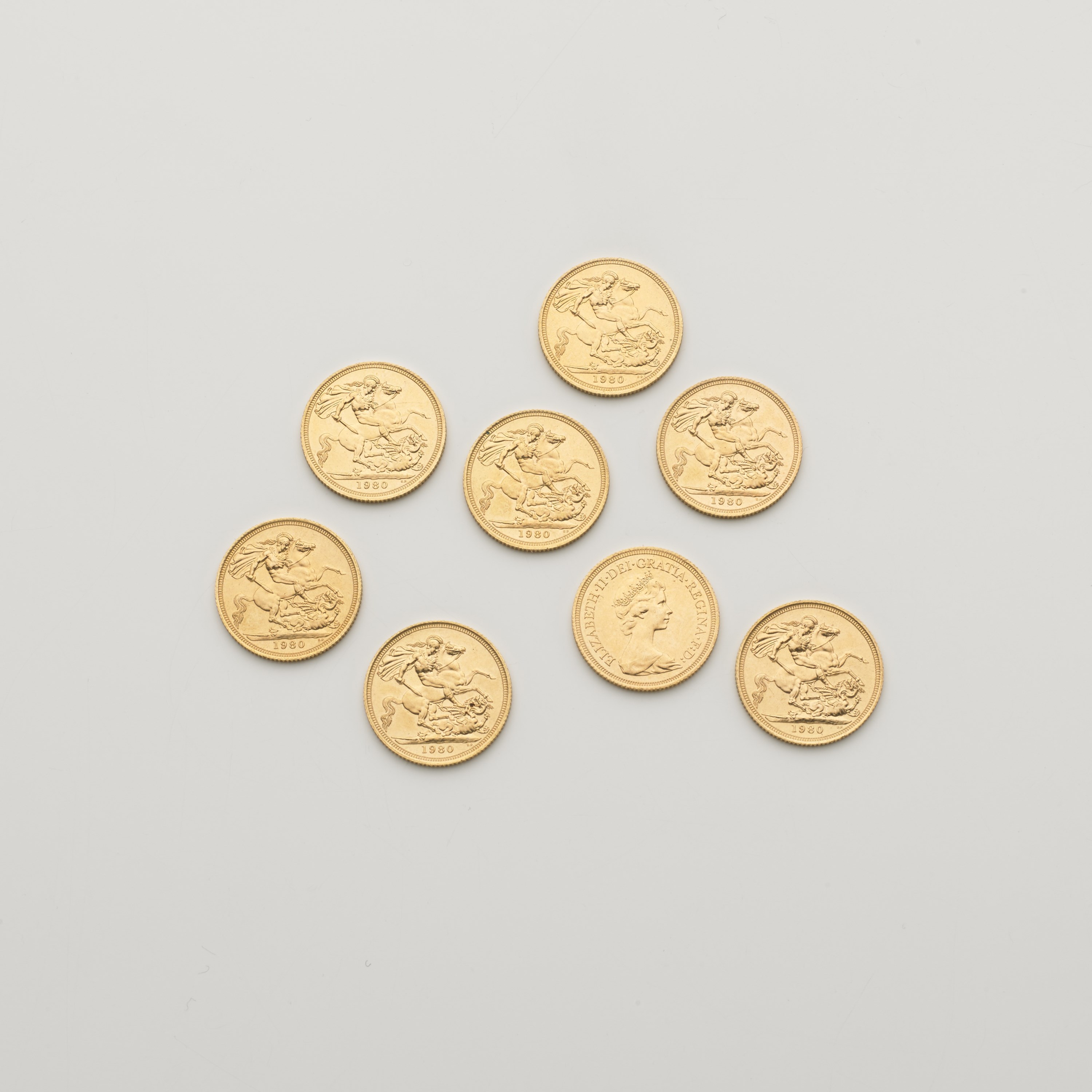 Lotto composto da otto sterline in oro tutto del 1980 nuovo conio complessivi g. 64 Lot comprising eight gold sovreigns dated 1980, new mint