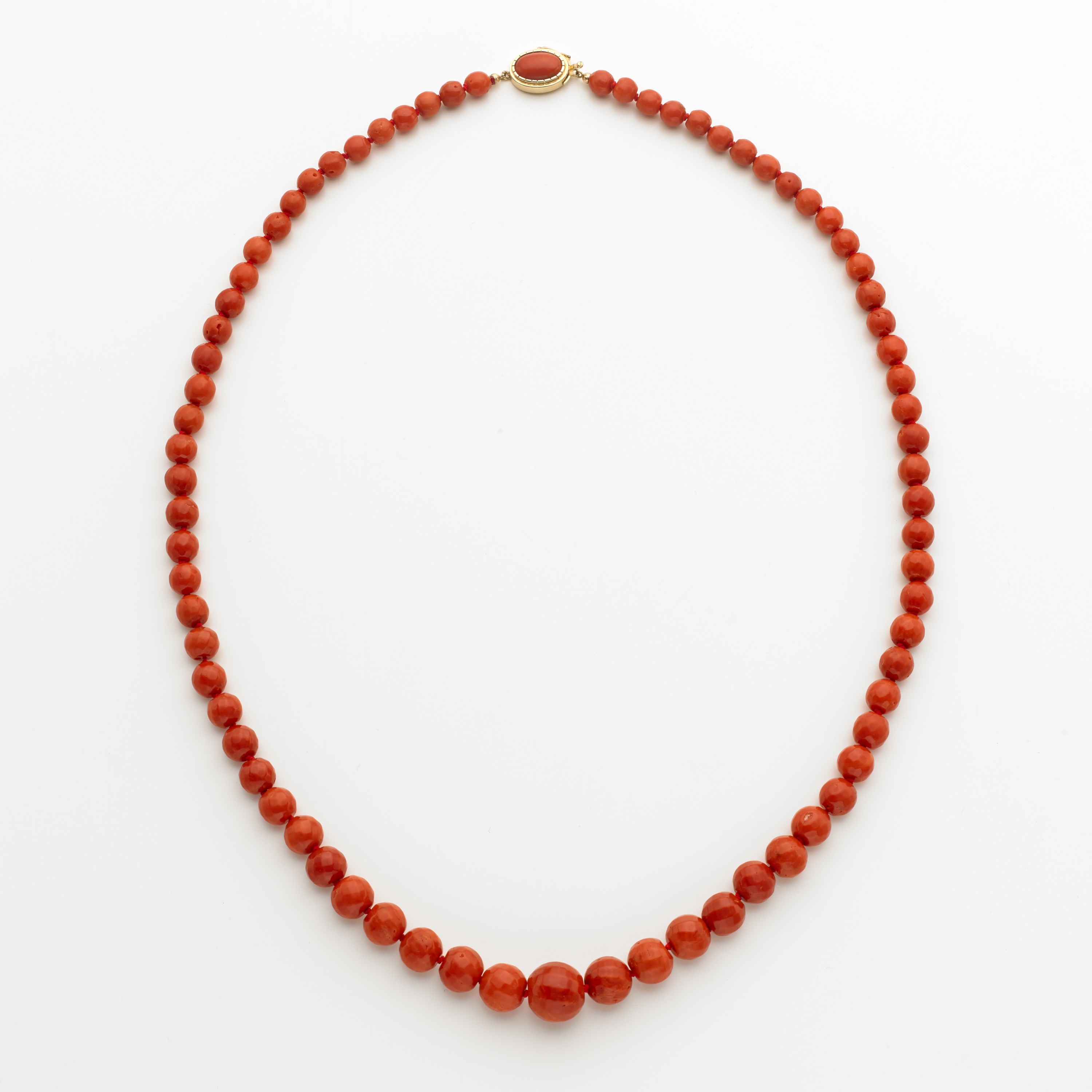 Collana in corallo Mediterraneo rosso arancio di boules sfaccettate scalate da mm 7 a mm 15 circa, chiusura in oro giallo con cabochon in corallo ovale g. 80,90 lungh. cm 70 Mediterraean red coral bead necklace with gold clasp