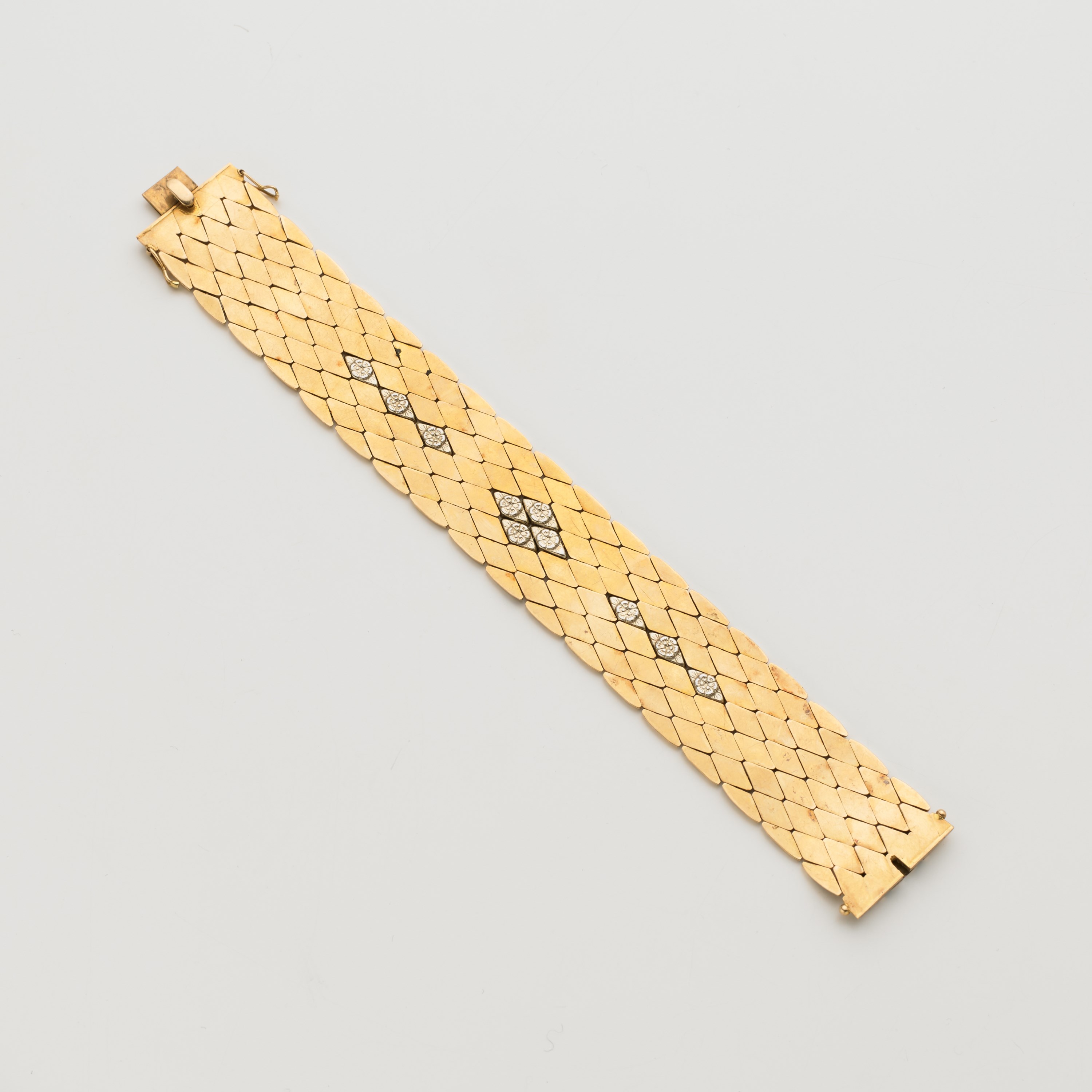Bracciale in oro giallo e bianco modulare, lungh. cm 20,5, h cm 2,4, g. 55,20 Bi-coloured gold bracelet