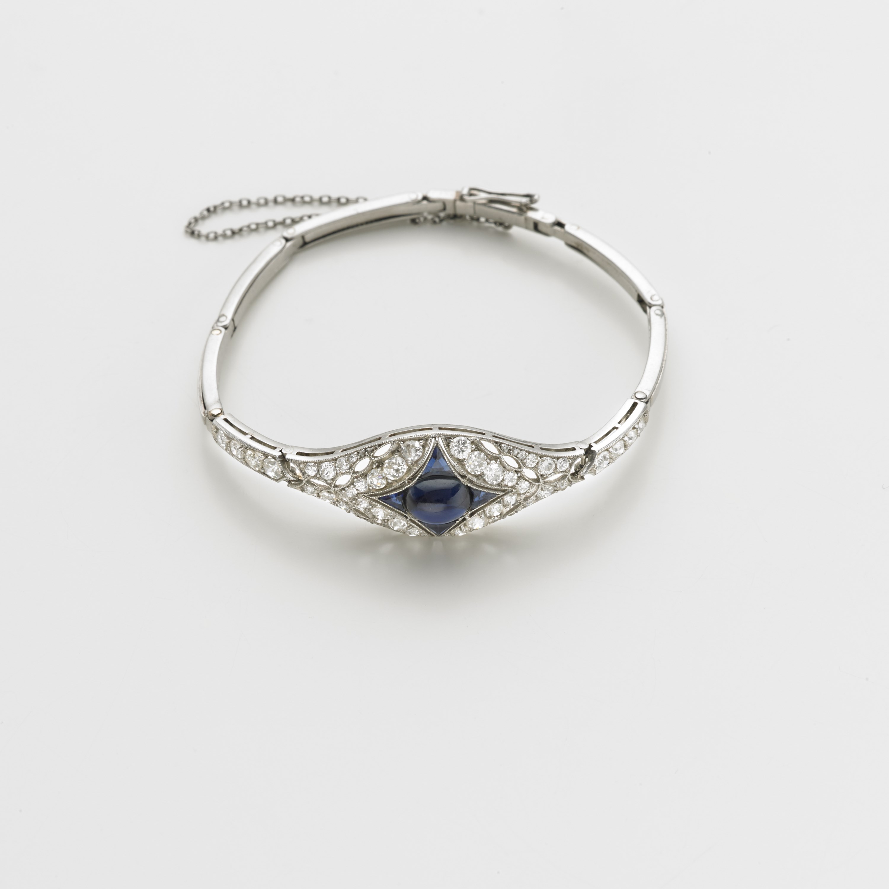 Bracciale in oro bianco semirigido, allungabile, con diamanti rotondi taglio vecchio, al centro zaffiro ovale cabochon e quattro piccoli zaffiri, g.14,50 Extensible white gold semirigid bracelet centered by an oval cabochon sapphire accented with diamonds and sapphires