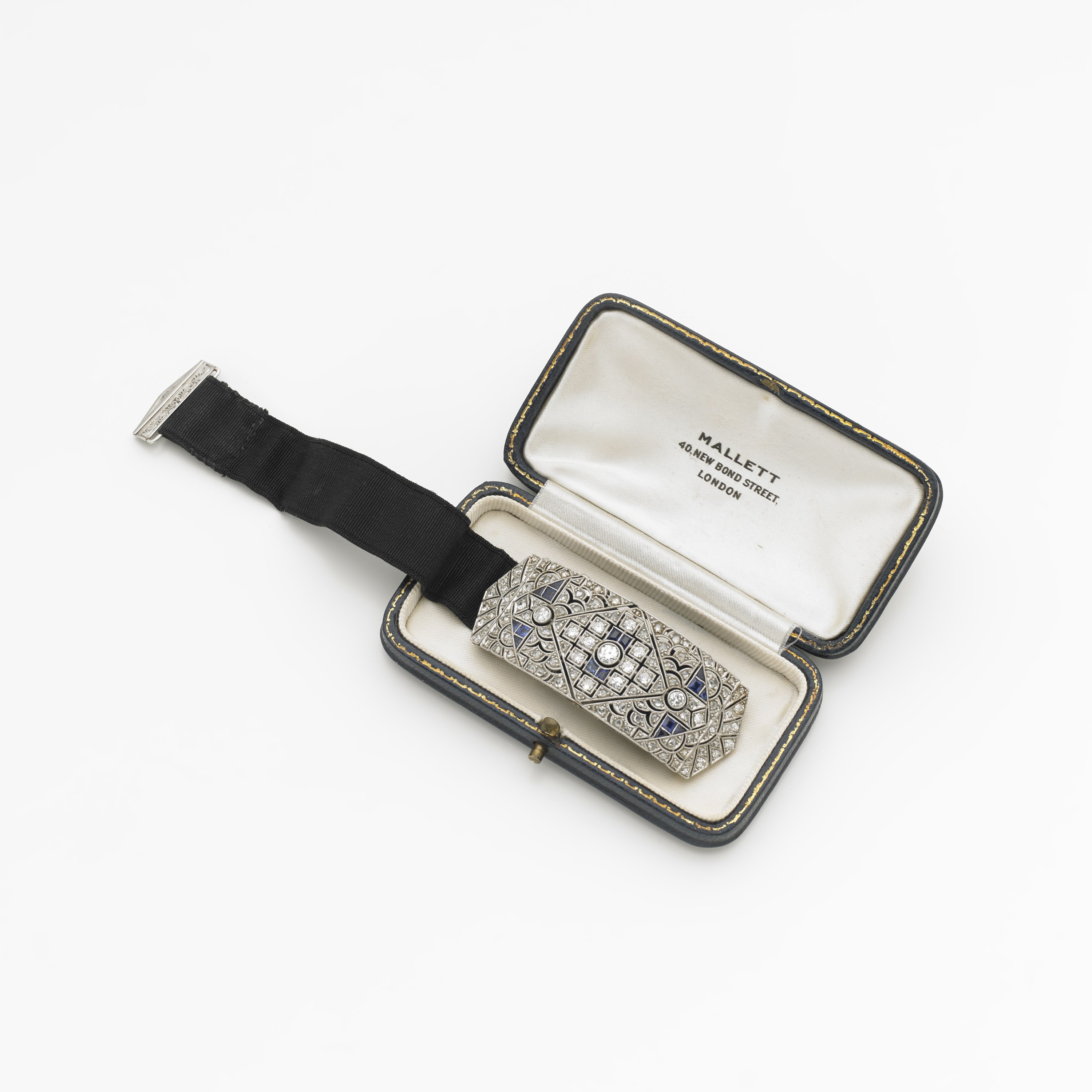MALLET LONDON Bracciale in platino con diamanti rotondi, zaffiri carrÈ e a triangolo parti esterne pieghevoli con cinturino in gros-grain nero complessivi g.20,20. In scatola originale Platinum, diamond and sapphire bracelet, with original case
