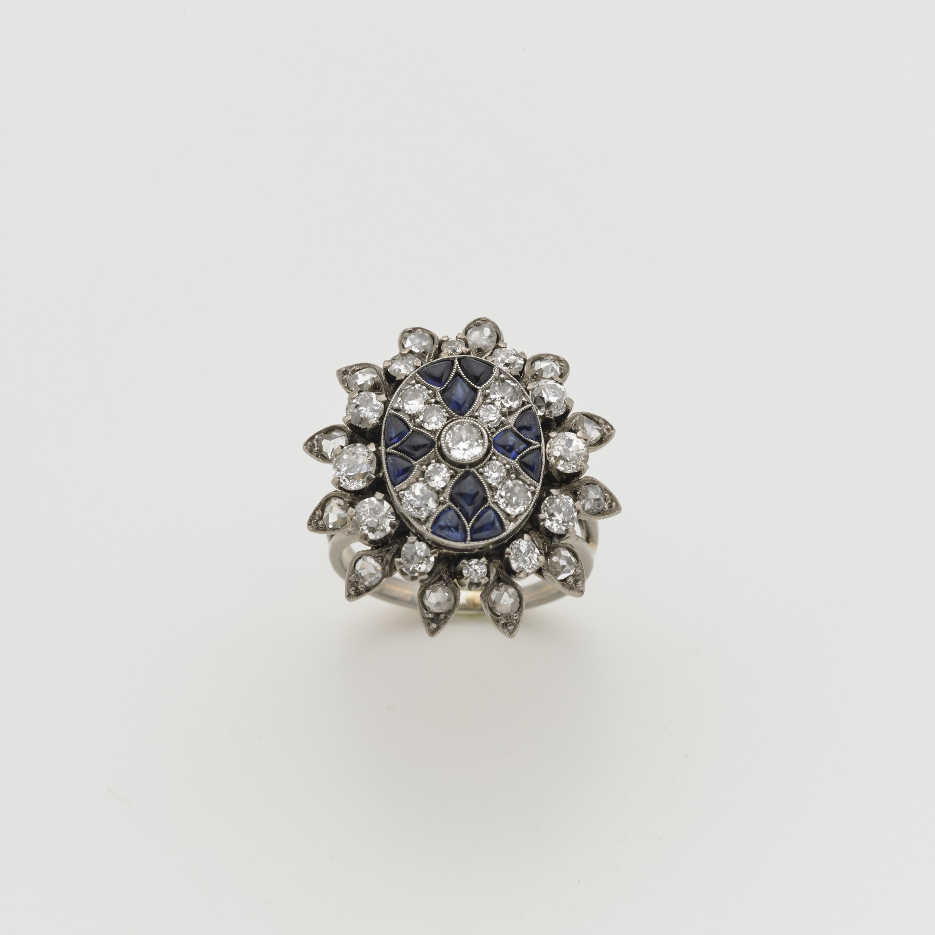 Anello in oro bianco e argento con diamanti rotondi e zaffiri cabochon g....