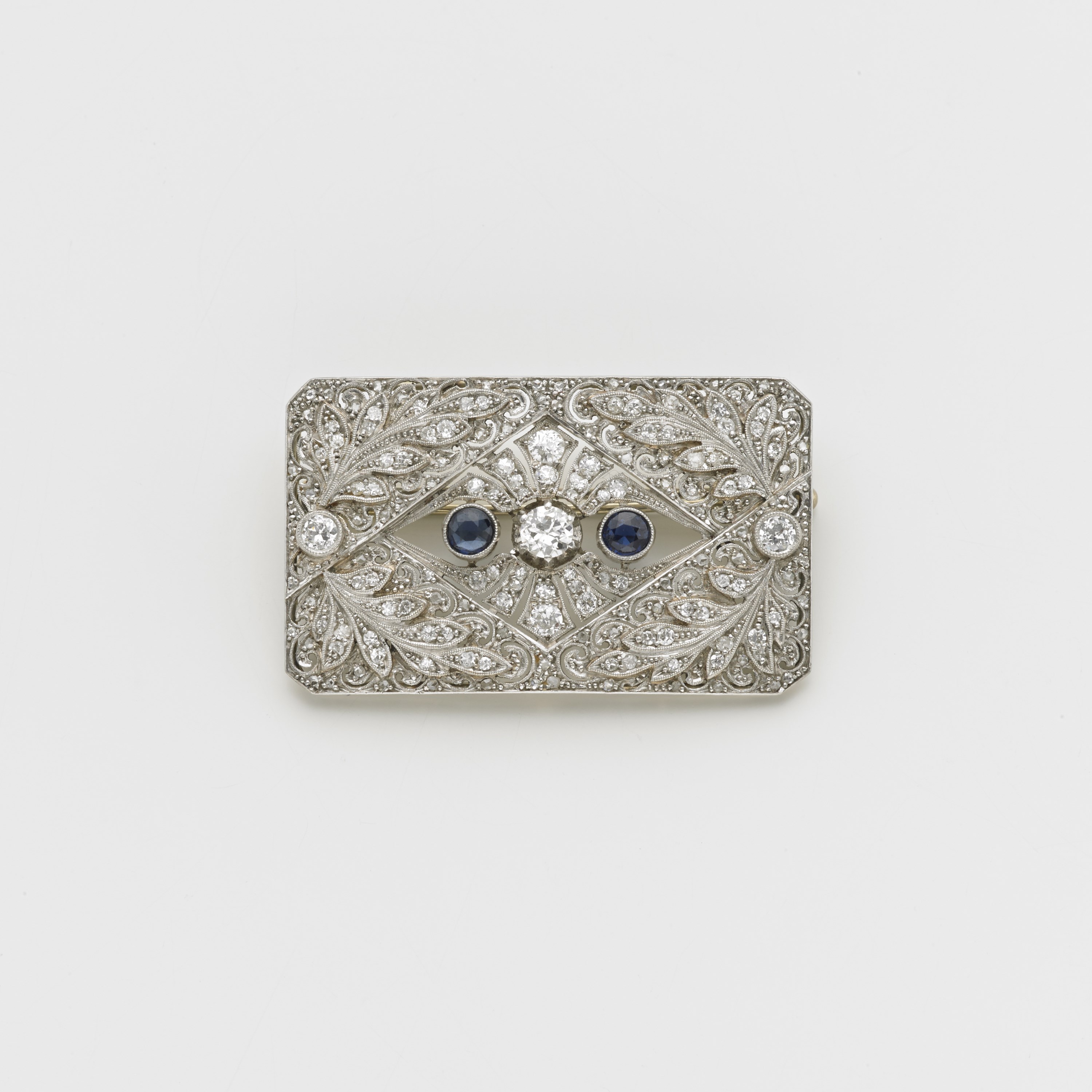 Spilla in platino con diamanti rotondi taglio antico huit-huit ed al centro due zaffiri rotondi taglio composito ai lati di un diamante pi˘ grande taglio vecchio europeo di circa 0,40, g. 22,30 lungh. cm 5 Sapphire and diamond platinum brooch