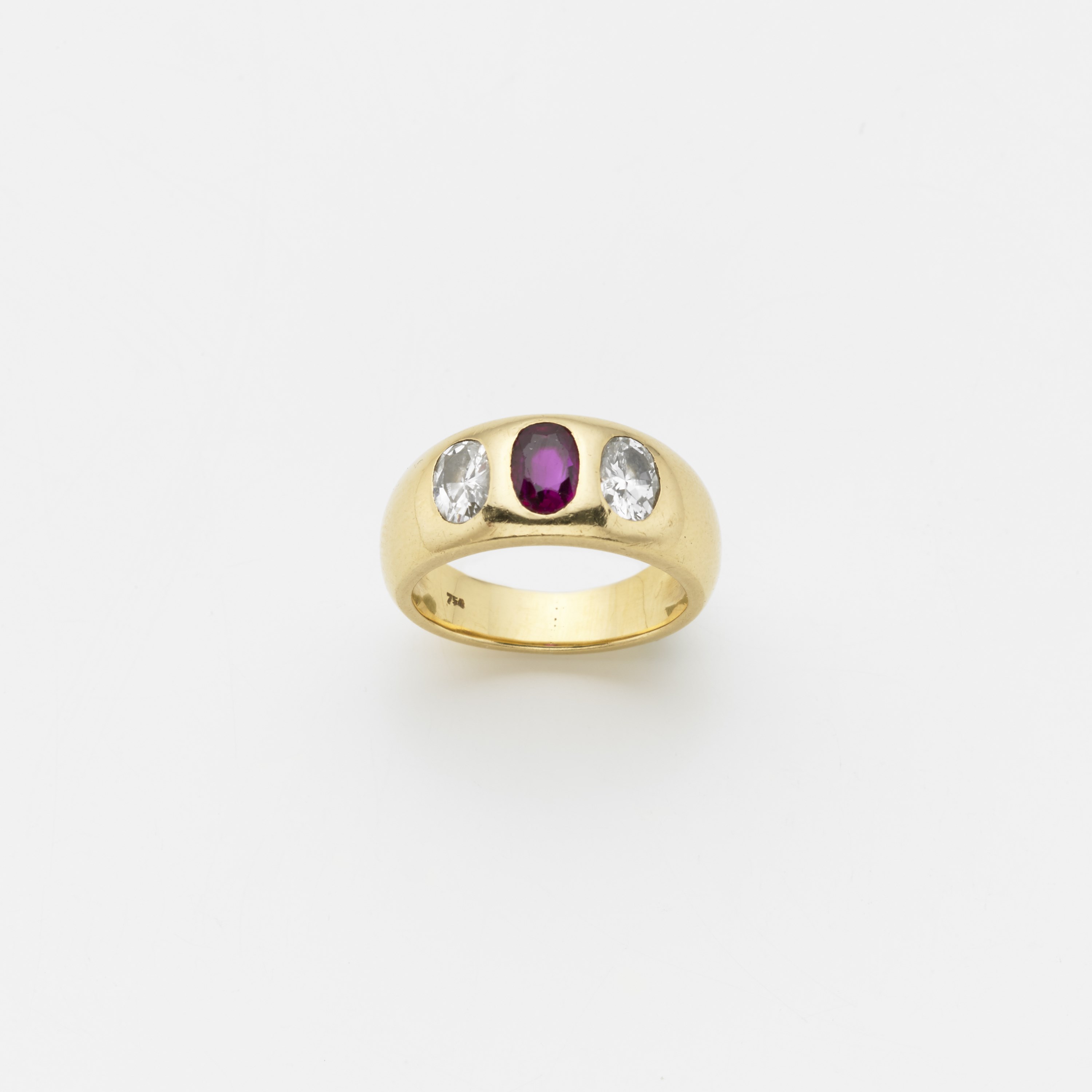 Anello in oro giallo con rubino ovale di ct 0,80 e due diamanti ovali di ct 0,50 l'uno circa, g. 10,90 misura 14/54 Accompagnato da certificato gemmologico CISGEM n. 3201 del 18/04/2016 Milano che certifica la naturalezza del rubino, l'assenza di trattamenti e la provenienza Myanmar Ruby and diamond gold ring Appended CISGEM jewellery report certifying the absence of treatments for the ruby and the provvenance from Myanmar