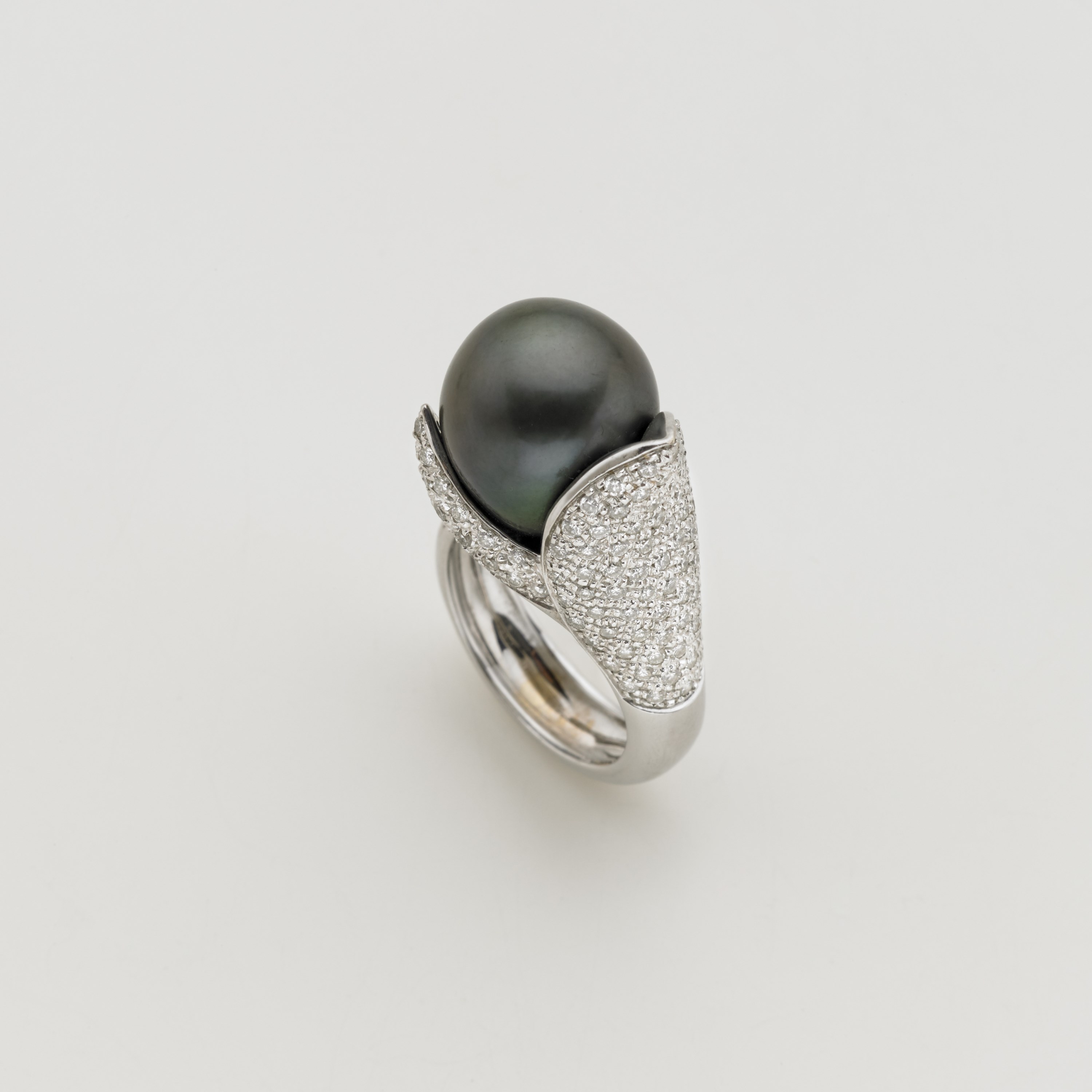 Anello in oro bianco a forma di bocciolo con perla nera centrale e pavÈ di diamanti, g.16,90 misura 16/56 Black pearl and diamond-set white gold ring