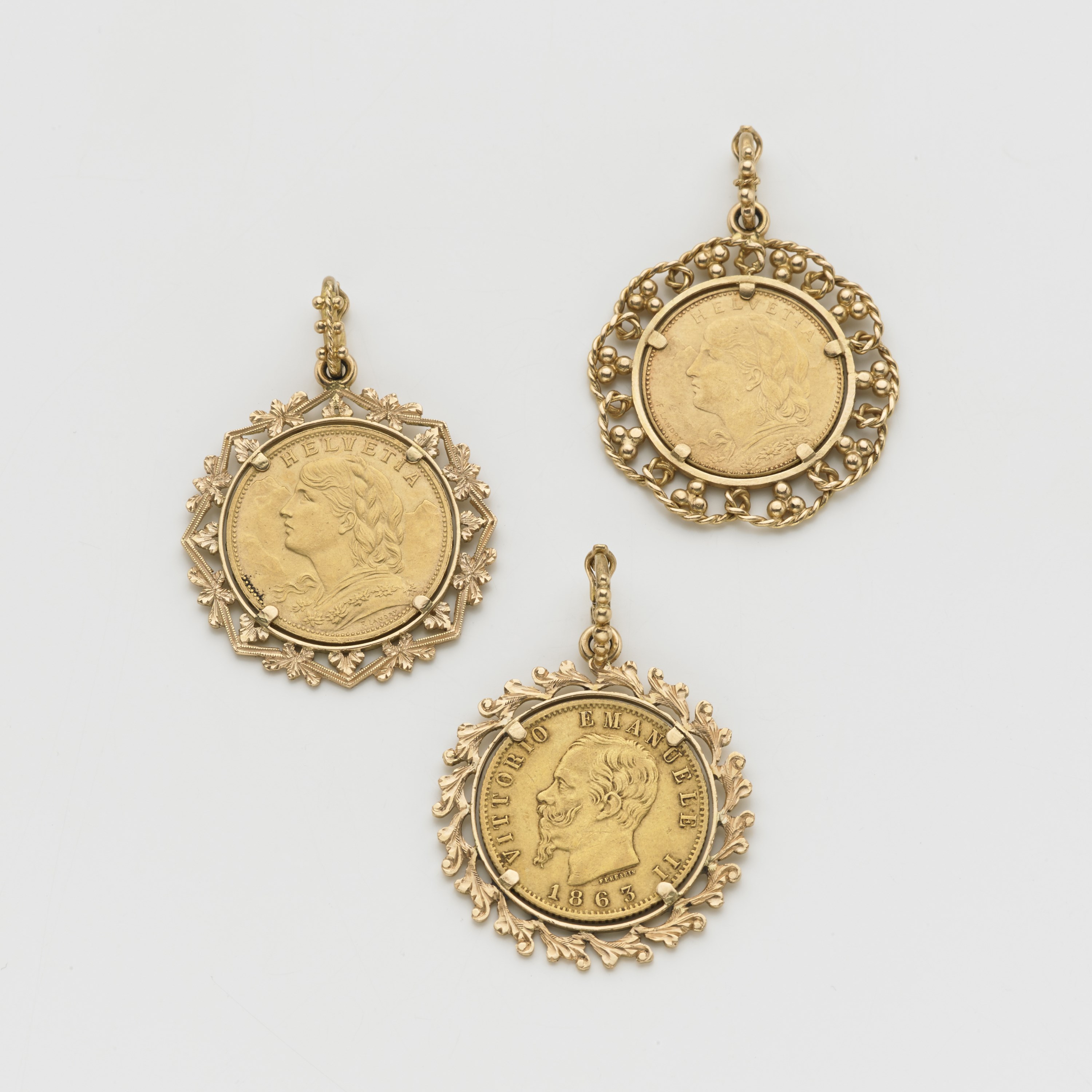 Tre pendenti in oro giallo con tre monete in oro (10 e 20 franchi svizzeri, e 20 lire Vittorio Emanuele) g. 27,60 Lot comprising three pendants with gold coins (10, 20 Swiss Francs and 20 Lire Vittorio Emanuele)