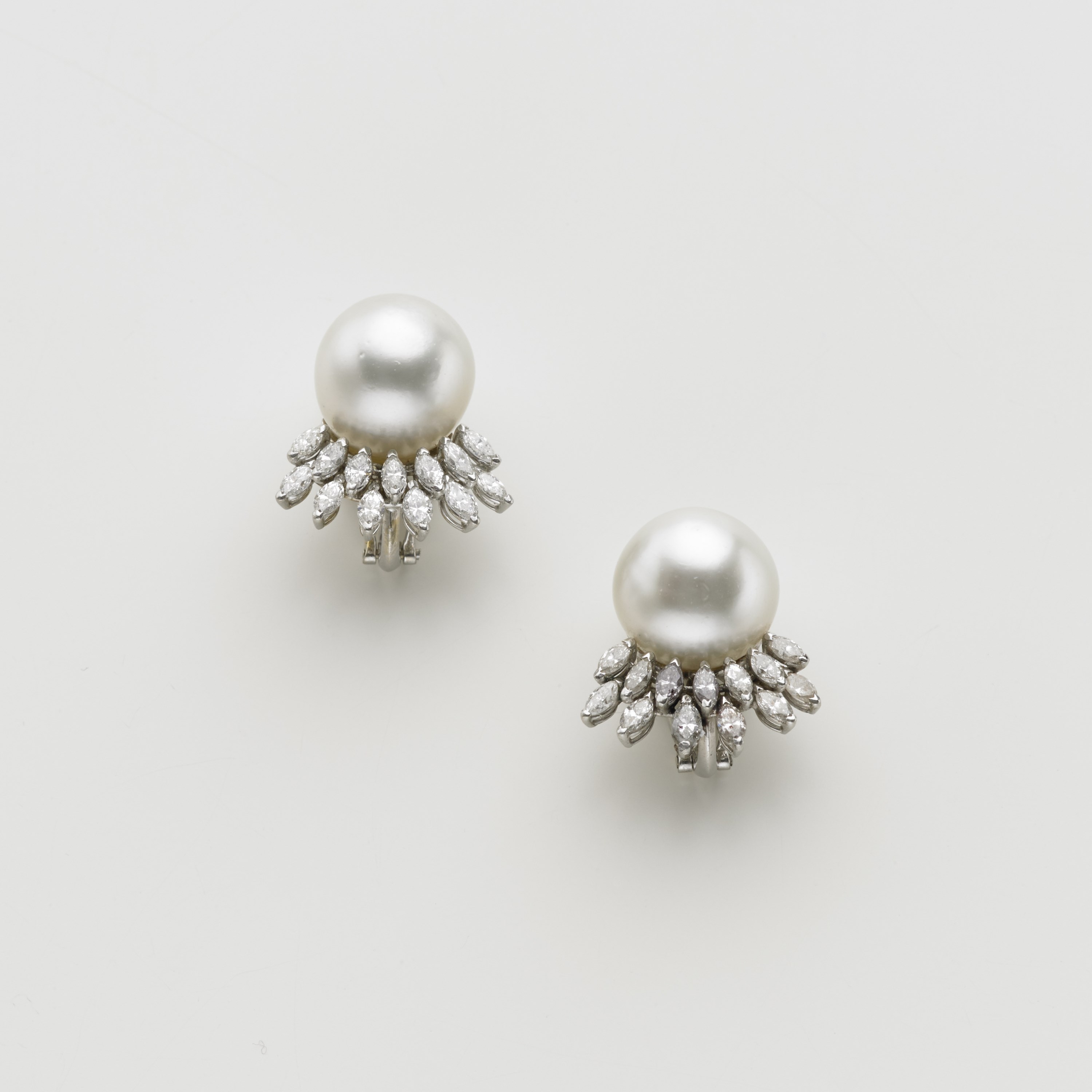 Orecchini a lobo con clips in oro bianco, perle bianche coltivate mm 12,15/12,45, rifinite con diamanti navette g. 12,20 Cultured pearl and diamond white gold ear clips