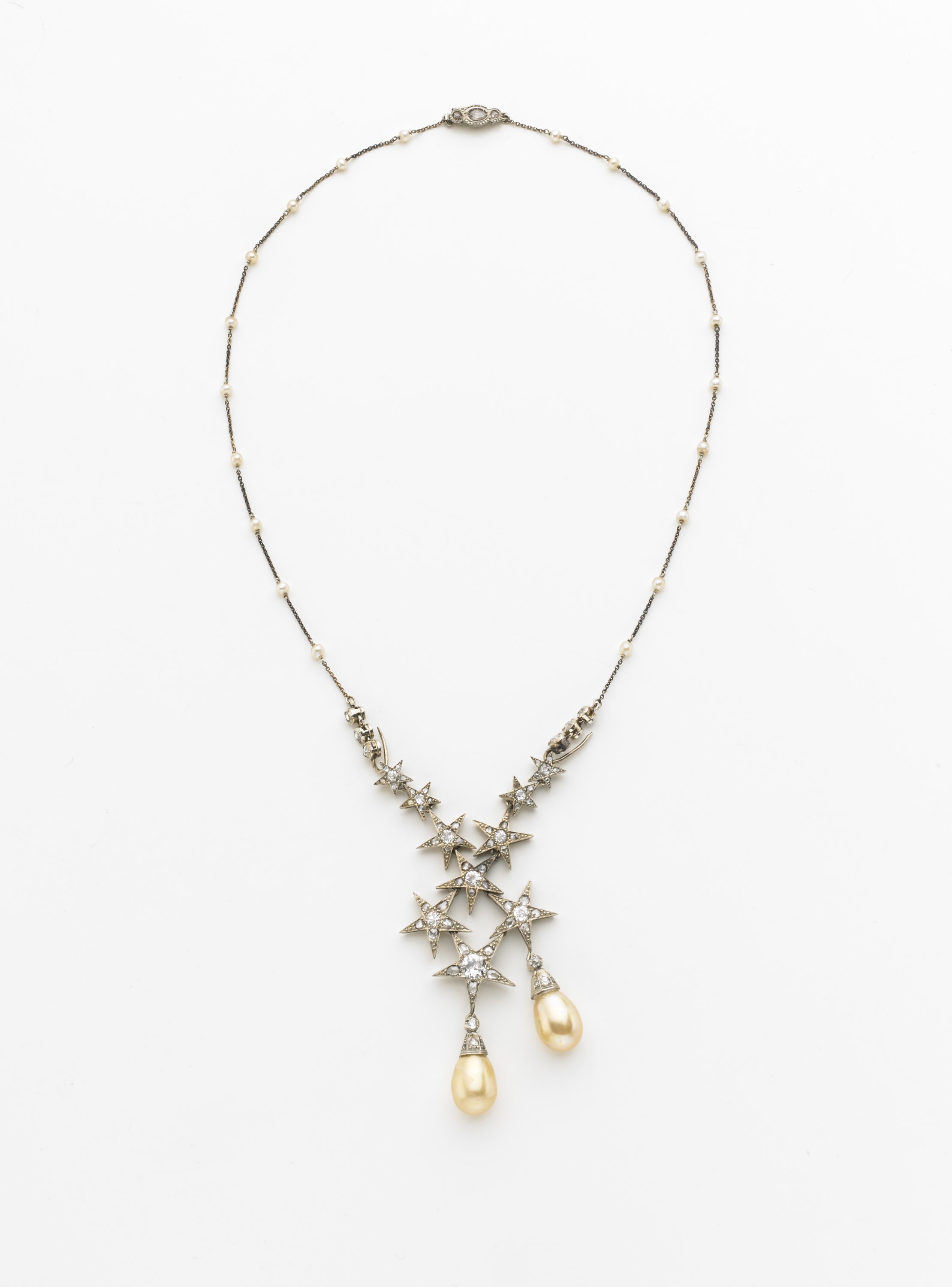 LUIGI PORRO VIA ORSO 8 MILANO Collier in oro bianco formato da catenina distanziata da perle bianche, chiusura e rifiniture con diamanti. La parte centrale Ë smotabile ed Ë terminata da due perle di vasca a goccia g. 20,80. Astuccio originale White gold chain necklace with pearl spacers. Diamond set details. Original case