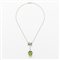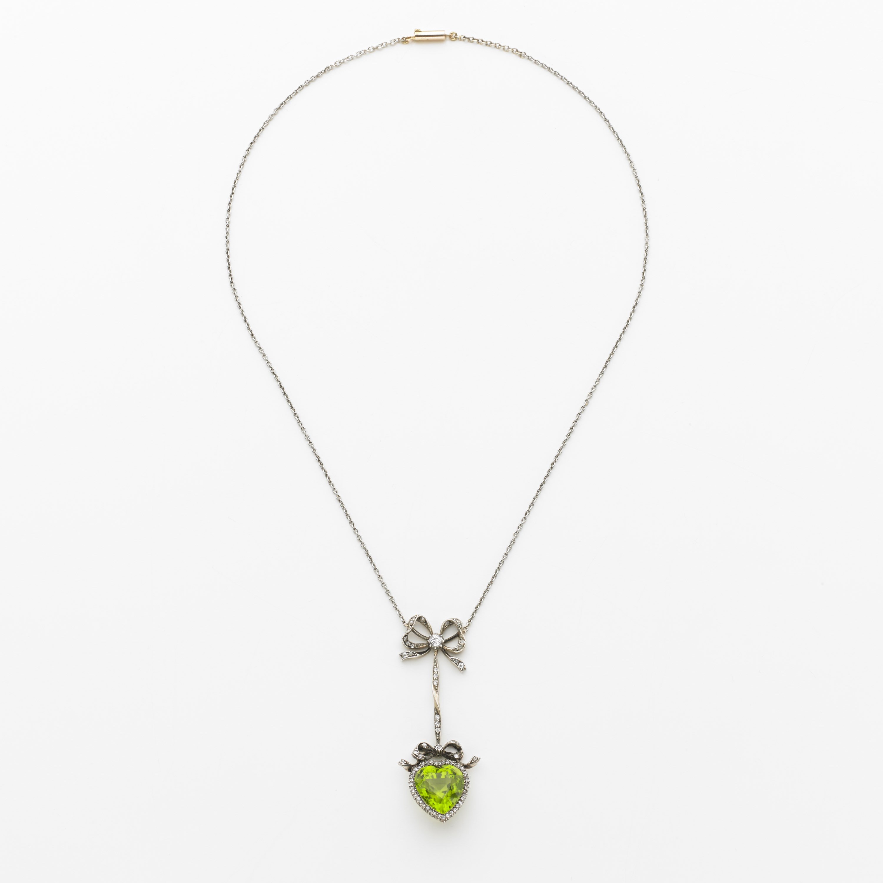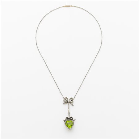 Catenina in oro bianco con chiusura in oro rosso e pendente in oro giallo 585/1000 e argento, con diamanti rotondi a formare due nastri e a contornare un cuore di peridoto di ct 9 circa lungh. pendente cm 5,5, g.9,60. Nella chiusura punzone n. 8158 White gold chain with red gold clasp and silver and gold pendant 585/1000 with peridot heart with diamond surround. Mark in the clasp