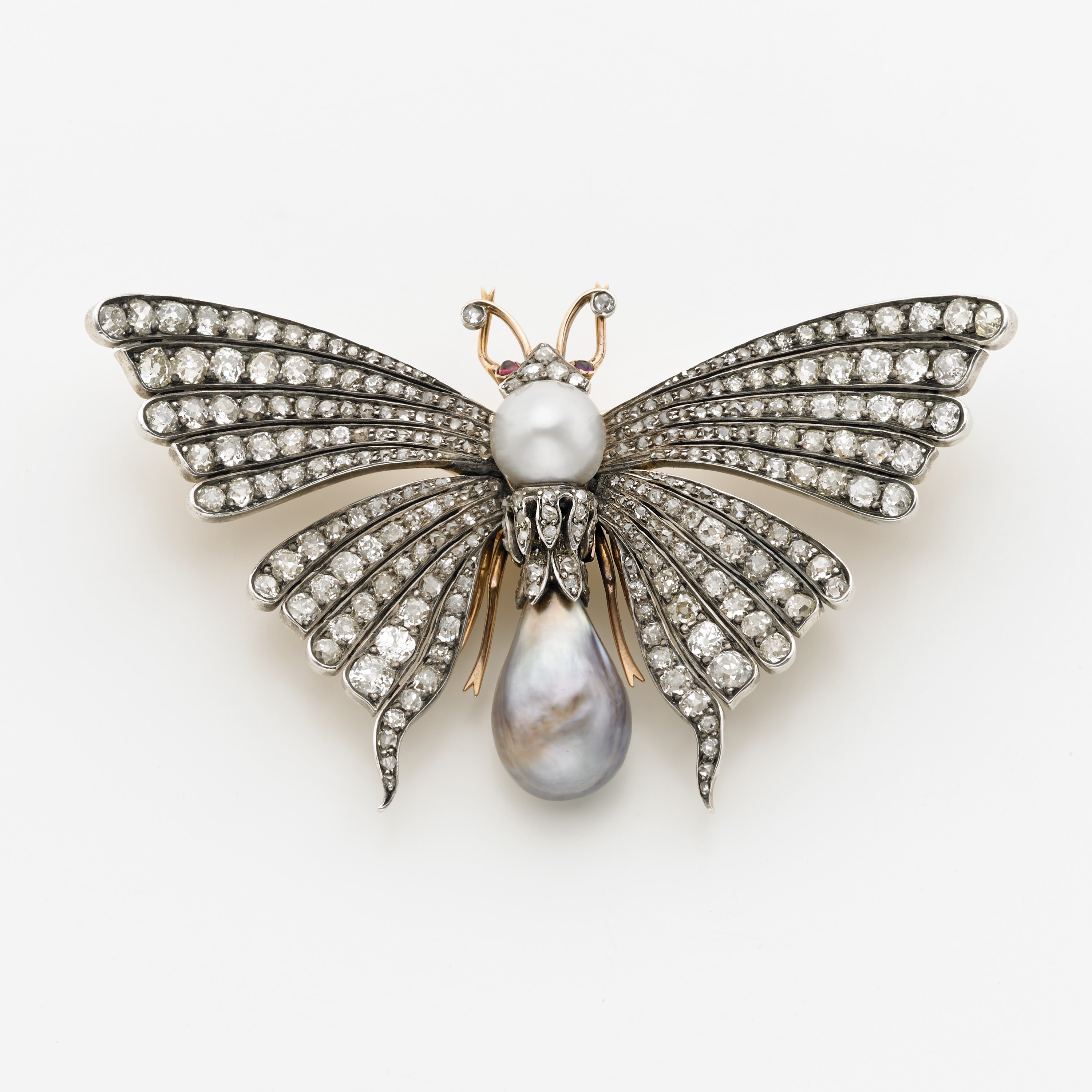 Spilla/ciondolo con possibilit‡ di essere applicata su tiara, a forma di farfalla in oro giallo, rosso e argento con incastonati dei diamanti rotondi taglio old mine ed due piccoli rubini cabochon, il corpo Ë completato da due perle naturali una bianca grigiastra e l'altra nera grigiastra g. 29,40, apertura alare cm 7,50. Accompagnato da analisi gemmologica perle CISGEM n. 2600 Milano del 09/02/2016, attestante che entrambe le perle sono d'acqua salata e di origine naturale Butterfly brooch pendant that may be applied to tiara in red and yellow gold and silver inset with two diamonds, two cabochon rubies and the body with two natural pearls. Appended CISGEM certificate for the two natural pearls