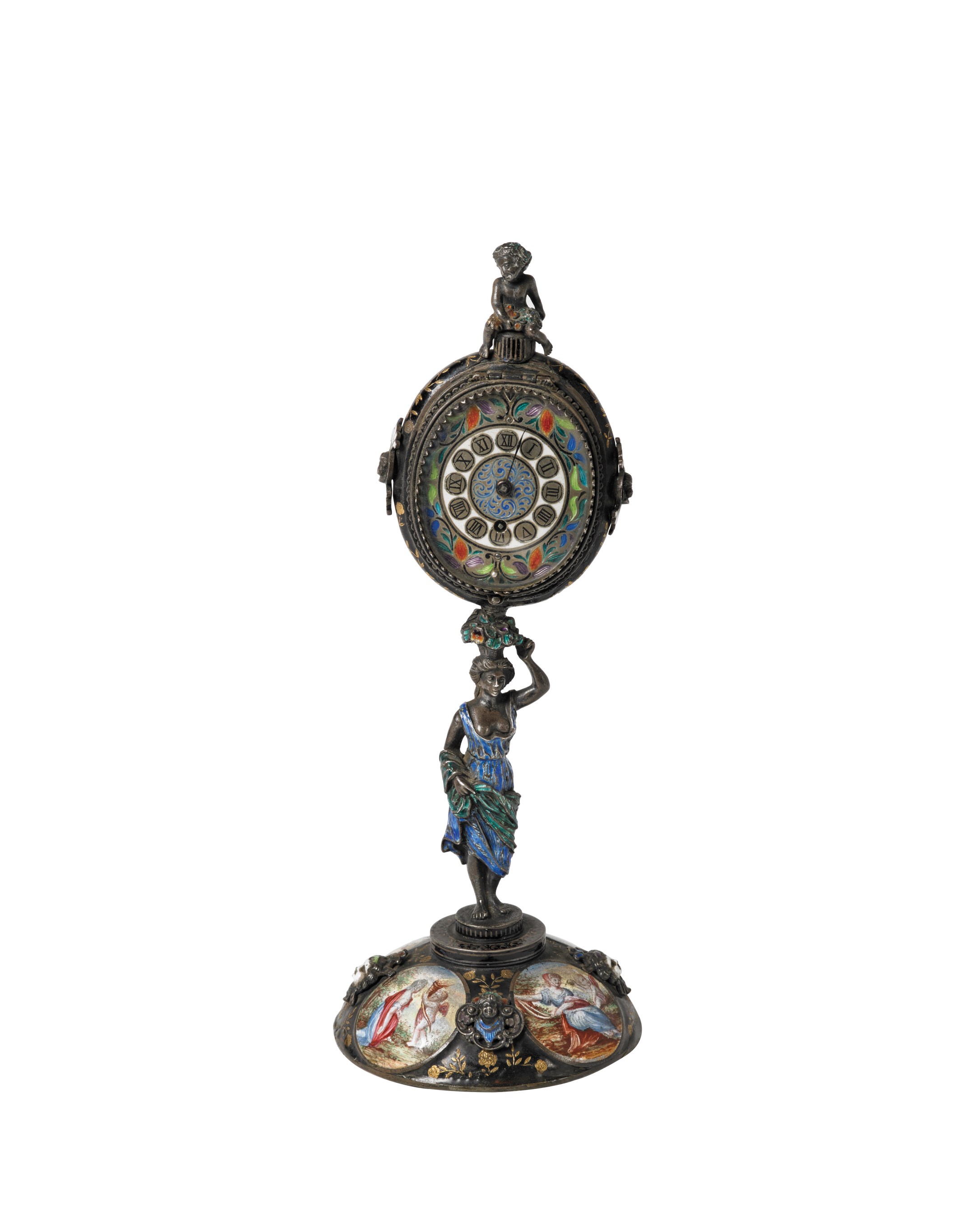 ANONIMO Piccolo orologio a ostensorio in argento e smalti policromi Epoca seconda met‡ sec. XIX Movimento firmato, con carica a chiavetta, scappamento a verga, firmato Brauss(...) A LA FERT BERNARD Quadrante di forma ovale in argento e smalti policromi, cifre romane Misura h cm 11,9 ANONYMUS Small silver and polychrome enamel monstrance shaped clock Second half of the 19th century Key-wind movement, signed Brauss(...) A LA FERT BERNARD Silver oval dial with Roman numerals