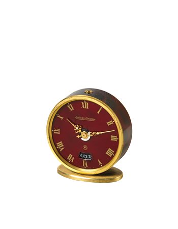 JAEGER LECOULTRE Orologio da viaggio Anni '70 Quadrante, movimento e cassa firmati Movimento con carica otto giorni e sveglia Quadrante color burgundy con cifre romane, finestrella per puntamento sveglia Diam. mm 45 JAEGER LECOULTRE Travel clock 1970's Eight day power reserve movement and alarm Burgundy dial with Roman numerals Con astuccio originale e garanzia