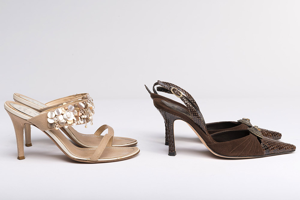 RENE CAOVILLA Lotto di due paia di sandali, uno in suede marrone e pitone con dettaglio gioiello e cinturino sul retro, l'altro con charms in madreperla (mis 35,5 e 36)