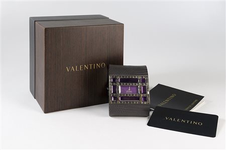 Valentino: orologio a bracciale con cinturino stampa rettile, chiusura color palladio e quadrante viola con baguette, in custodia originale e garanzia