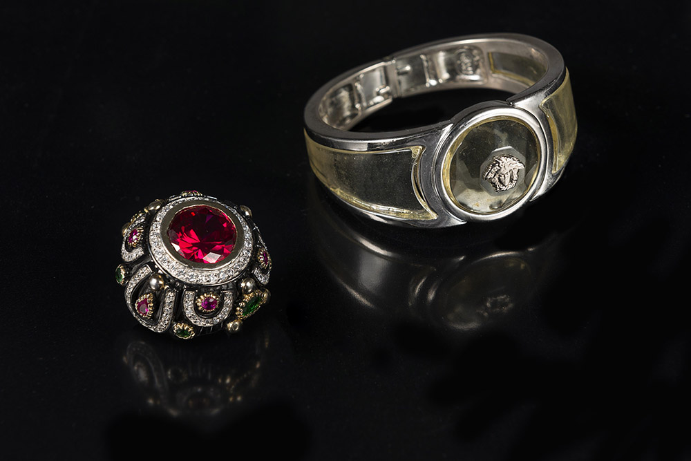 GIANNI VERSACE e anonimo Lotto composto da bracciale rigido con apertura a scatto in materiale plastico trasparente e con medusa centrale e anello a ricordarlo con pietra rossa centrale