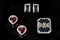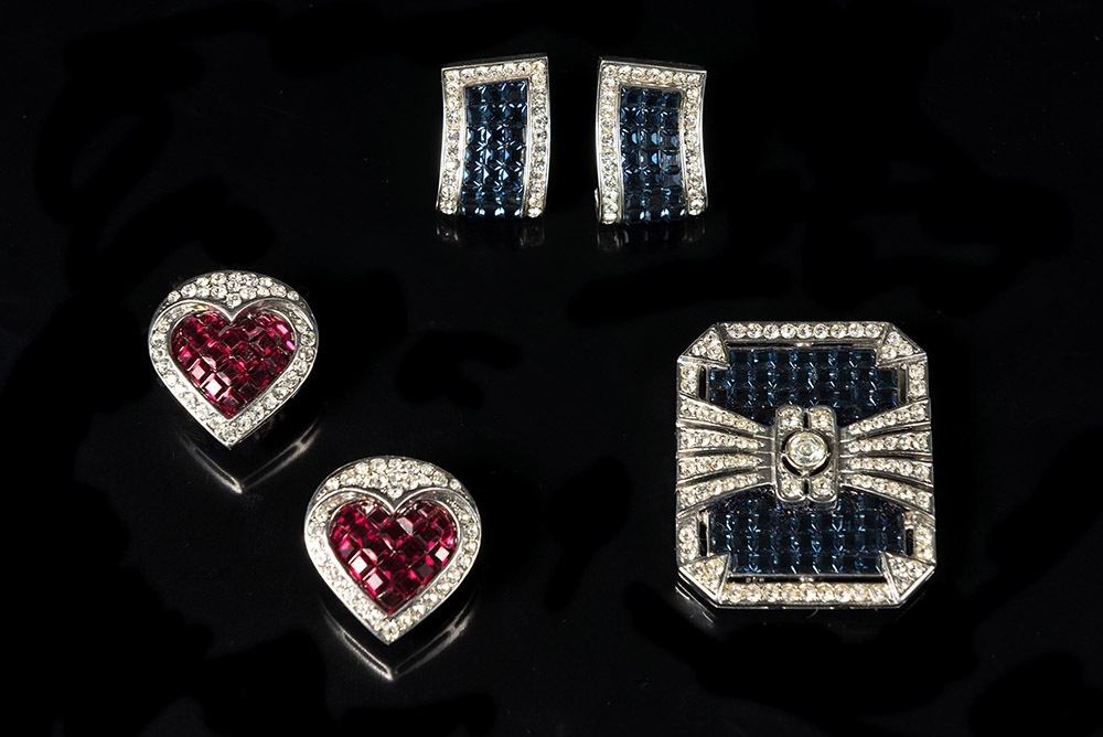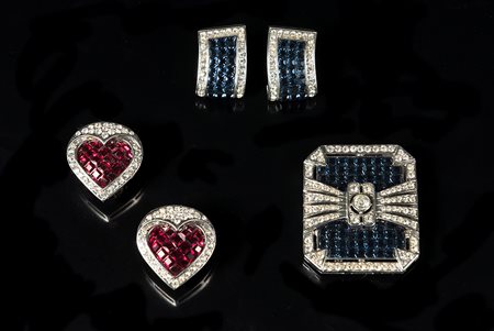 Lotto composta da una spilla stile dÈco in strass inclori e blu con orecchini a clips en pendant e un paio di orecchini a cuore in straa rossi e incolori, tutto ad invisible set. La spilla blu e gli orecchini rossi in argento 925/000