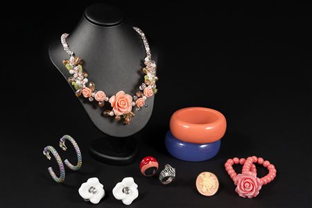 LOTTO COMPOSTO DA: * due bangle in materiale plastico, una pervinca l'altra color corallo * collier fantasia con pietre briolÈ, perle fancy e rosa centrale * orecchini a forma di fiore in materiale plastico bianco e strass centrale * bracciale a boules simil corallo con rosa centrale * anello con labbra * anello zebrato * cammeo * anelle in strass color pastello