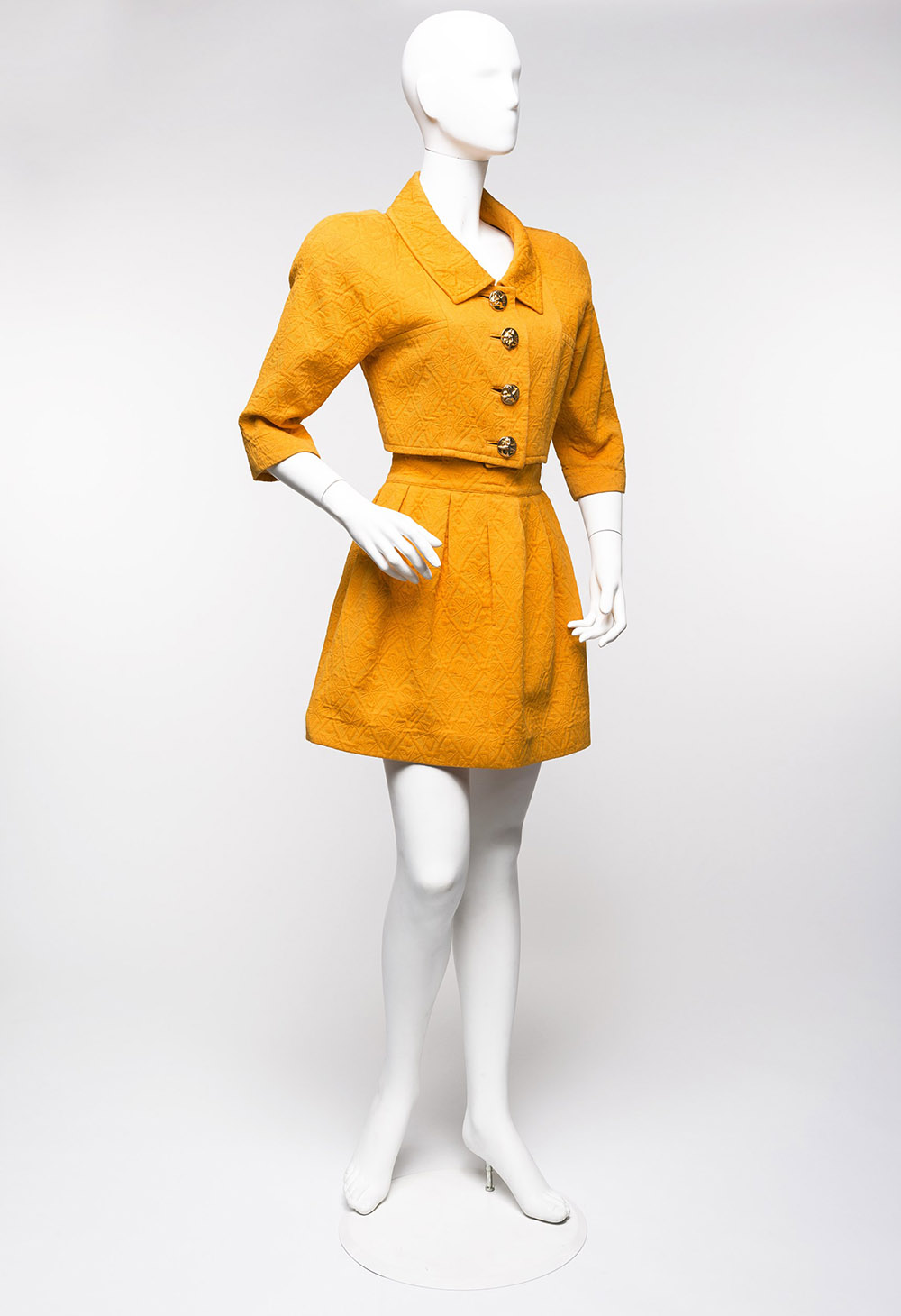 CHRISTIAN LACROIX, PERIS prÍt-‡-porter Tailleur in misto cotone color giallo sole con bottoni gioiello (tg I 42) (lievi difetti)