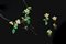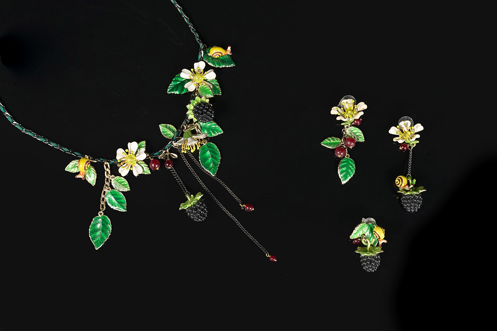 Demi-parure in metallo color oro e brunito con foglie e boules varie a ricordare un bosco di more, bacche e fiori. Gli orecchini sono tre e utilizzabili vicendevolmente