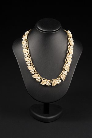 TRIFARI Collier in metallo color oro lucido e satinato a guisa di foglie con bacche di perle fancy bianche