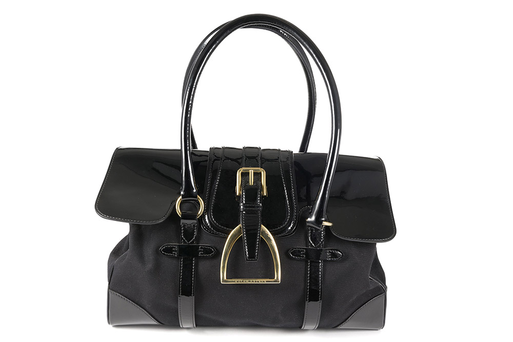 RALPH LAUREN Grande borsa a doppio manico in tela e vernice nera, dettagli in metllo color oro con staffa logata, certificato di autenticit‡, cm 38