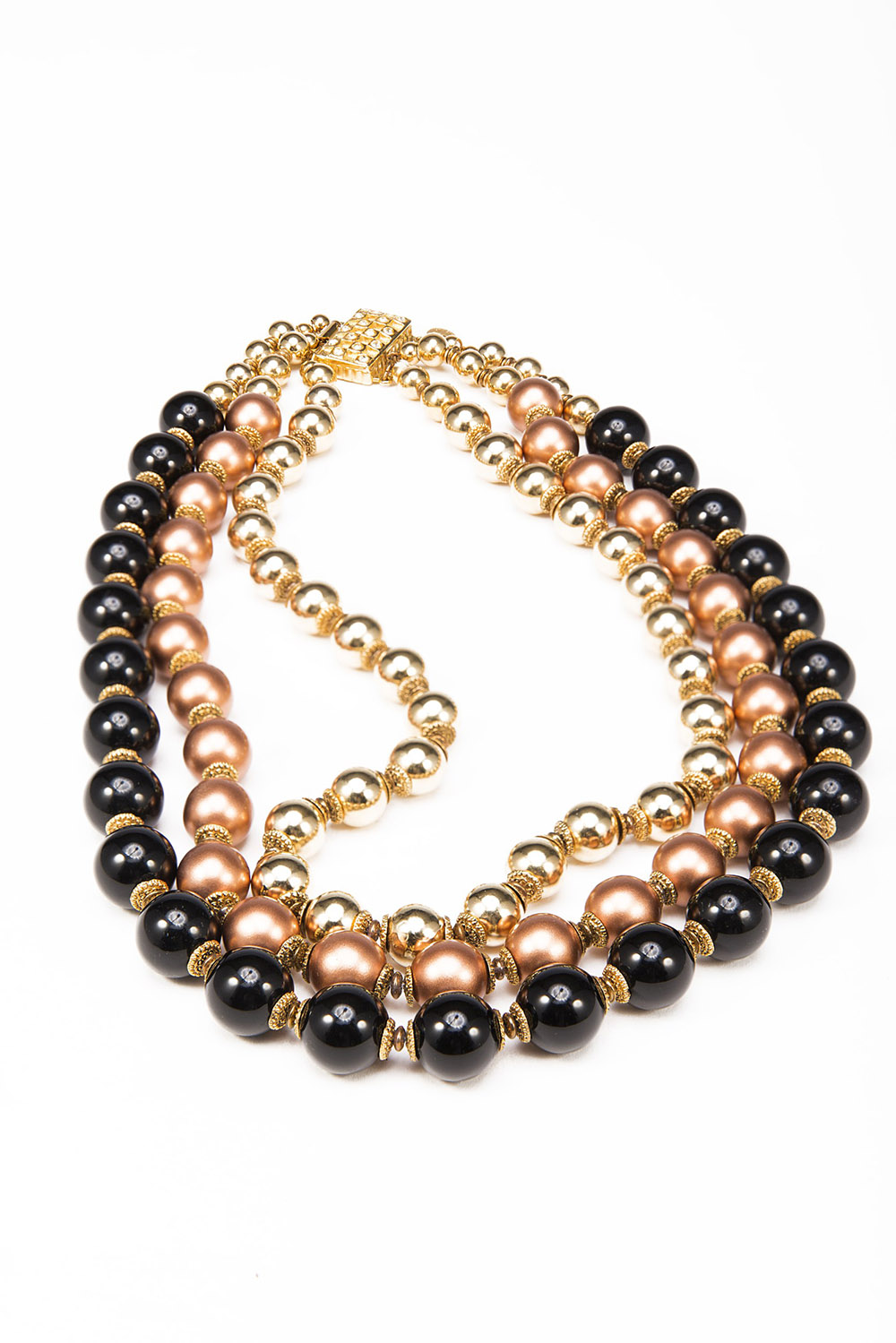 VALENTINO Collana con tre fili di boules color nero, rame e oro, chiusura rifinita in strass, astuccio originale