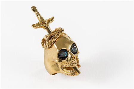 ALEXANDER McQUEEN Anello con teschio, catena e spada e due strass blu a segnare gli occhi, tutto in matallo color oro con sacchetto originale