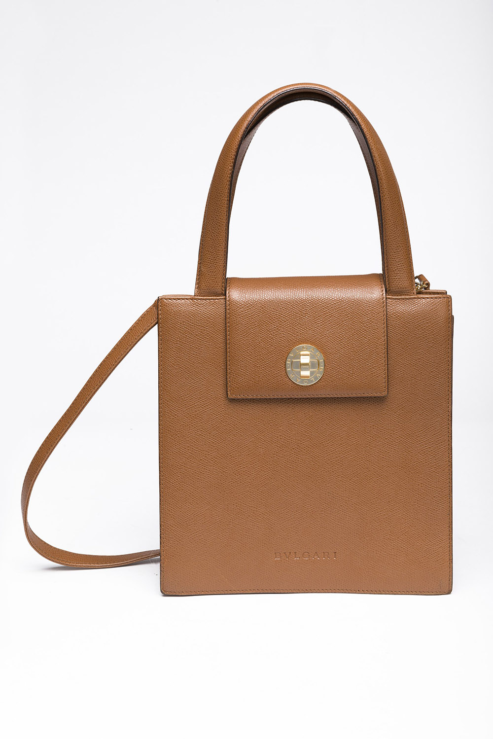 BULGARI Borsa in cuoio color tabacco a pi˘ scomparti, doppio manico e tracolla, chiusura classica logata, custodia originasle, cm 24
