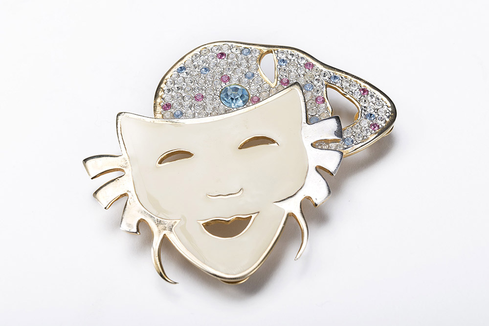 VALENTINO Grande spilla a forma di maschera carnevalesca in metallo color oro con smalto e strass