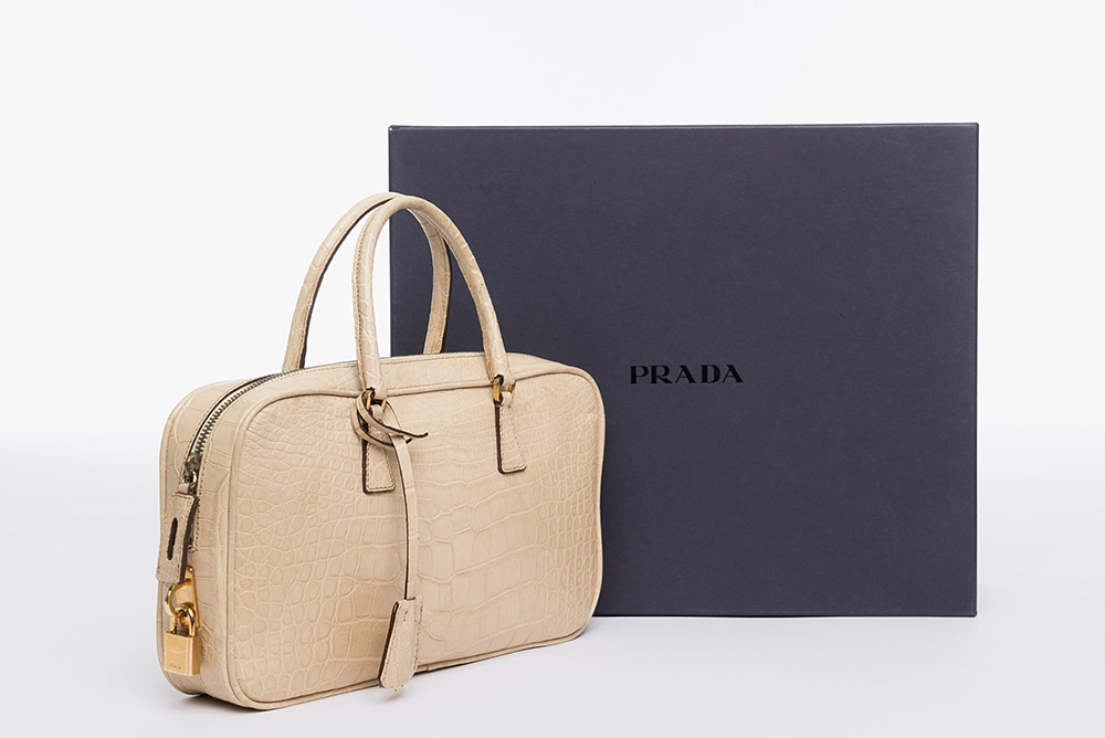 Prada: borsa in coccodrillo naturale, chiave e lucchetto color oro, largh. cm 29, in scatola originale. Pre-convenzione Cites (lievi difetti)