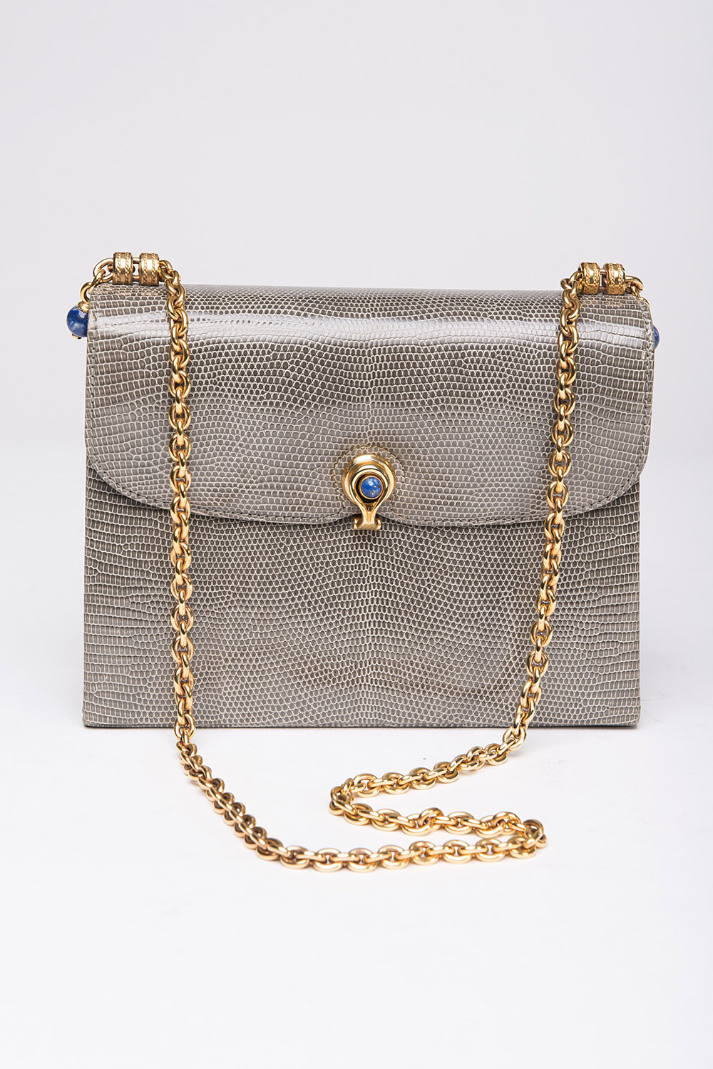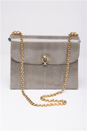 GUCCI, FIRENZE Borsetta con tracolla in lucertola grigia. Catena in metallo dorato e finiture in lapislazzulo. Scatola e sacchetto originali, cm 20,50