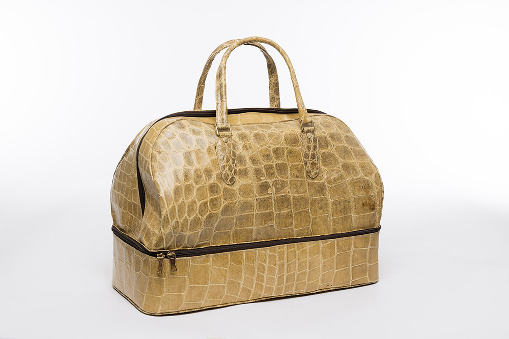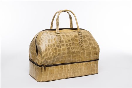 Alborea Milano: borsone in coccodrillo colore naturale, con fondo rigido portascarpe, largh. cm 55. Pre-Convenzione Cites(lievi difetti)