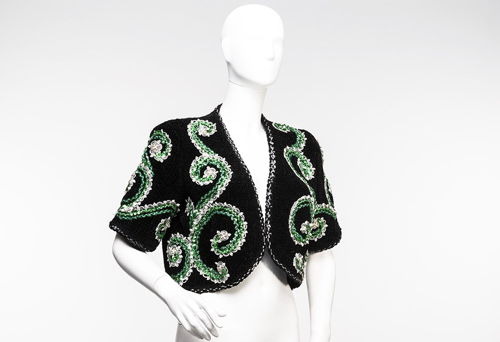 Coprispalle in maglia di ciniglia nero con ricami in paillettes e perline, verdi e argento