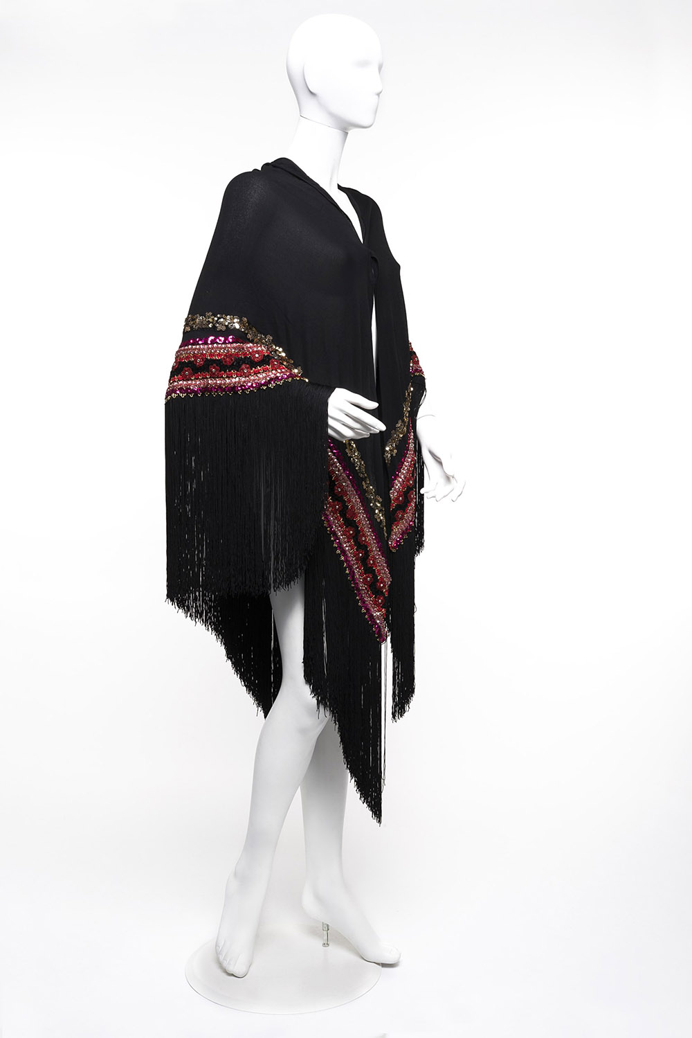 Scialle a triangolo in maglina nera con lunghe frange e ricami in paillettes...