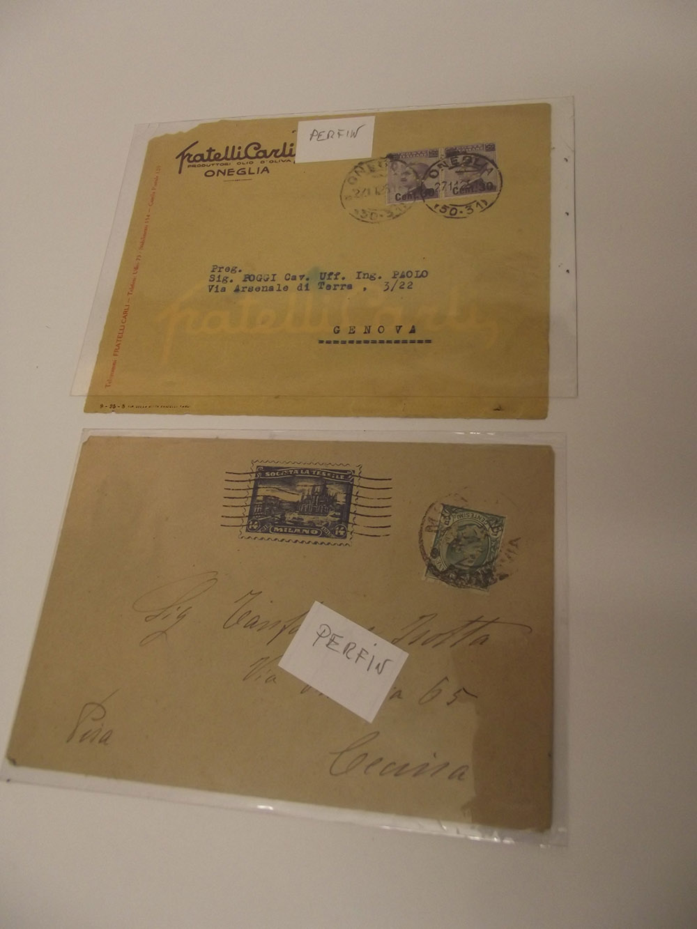 [REGNO D'ITALIA, PERFIN] Lotto di due oggetti, un frontespizio intestato Fratelli Carli Oneglia e una busta Societ‡ La Tessile, Milano.