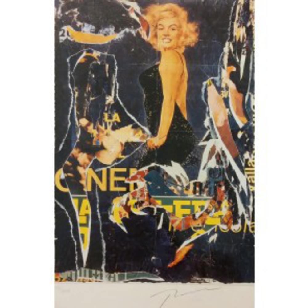 Rotella Mimmo (Catanzaro, 1918- Milano, 2006) - Merini Alda (Milano, 1931-2009) MARILYN (MARILYN, BELLEZZA ETERNA), 2005 Seridécollage su carta + poesia 50x70 cm P.A. di una tiratura a 199 esemplari + 19 P.A. "ad personam" Firmato a matita in basso a destra, a sinistra, P.A. L'opera proviene dal libro d'arte : Marilyn Bellezza eterna", di Mimmo Rotella e Alda Merini, 2005 Silkscreen and décollage multiple on paper + poetry 50x70 cm P.A. from the edition of 199 + P.A. "ad personam" Signed in pencil, lower right; P.A., lower left seridecollage su carta, 50x70 cm, firma e tiratura a matita in basso Dècollages di Mimmo Rotella proveniente dal libro: “MARILYN Bellezza eterna”, di Mimmo Rotella e Alda Merini. Questo celebre Dècollages è abbinato ad una Poesia inedita di Alda Merini, proprio come tutti gli altri Dècollages presenti nel libro; tiratura: 199 esemplari, tutti firmati e numerati.