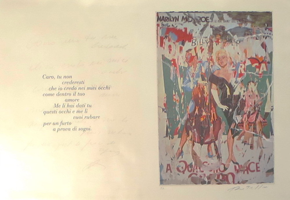 Rotella Mimmo (Catanzaro, 1918- Milano, 2006) - Merini Alda (Milano, 1931-2009) A QUALCUNO PIACE CALDO (MARILYN BELLEZZA ETERNA), 2005 Seridécollage su carta + poesia 50x70 cm P.A.di una tiratura a 199 esemplari + 19 P.A. "ad personam" Firmato e numerato in basso a destra L'opera proviene dal libro d'arte : Marilyn Bellezza eterna", di Mimmo Rotella e Alda Merini, 2005 Silkscreen and décollage multiple on paper + poetry 50x70 cm P.A. from an edition of 199 + P.A. "ad personam" Signed and numered in pencil, lower right
