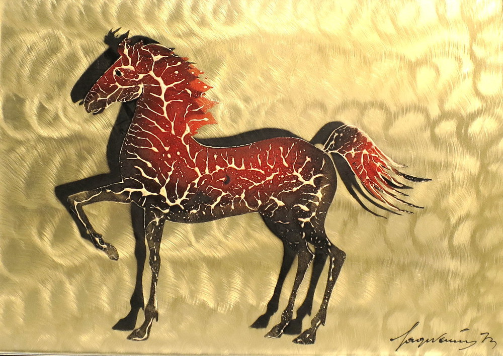 Vernis lastra di metallo dipinto raffigurante cavallo.