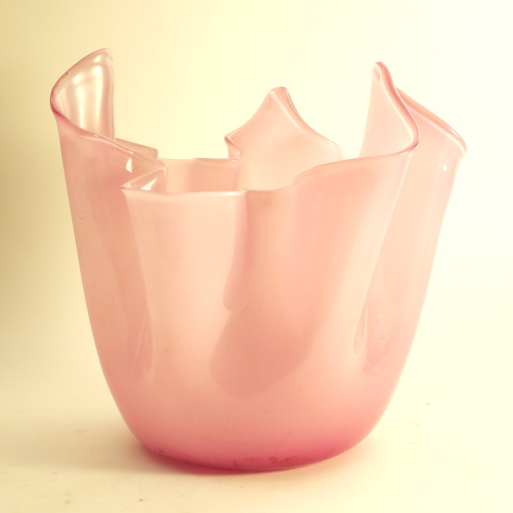 Vaso a fazzoletto in vetro incamiciato rosa e bianco firma ad acido "Venini Murano Italia" anni '50