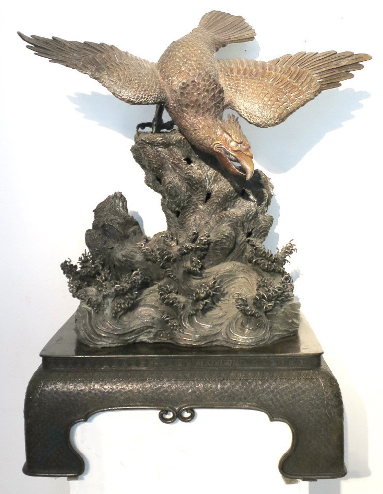 Grande Okimono aquila in bronzo su base scolpita e lavorata giappone meiji...