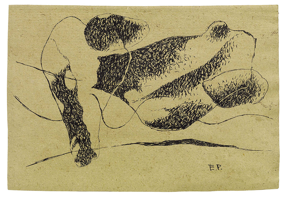 Enrico Prampolini, Modena 1894 - Roma 1956, Paesaggio cosmico, (1930), Inchiostro su carta, cm. 18x26,2, Sigla in basso a destra: E.P. Al verso della cornice: etichetta, con n. 8892, e timbro Arte Centro, Milano (opera datata 1930)., Esposizioni: Enrico Prampolini, Milano, Arte Centro, novembre 2002 - gennaio 2003, cat. n. 16, illustrato a colori (con misure errate).,