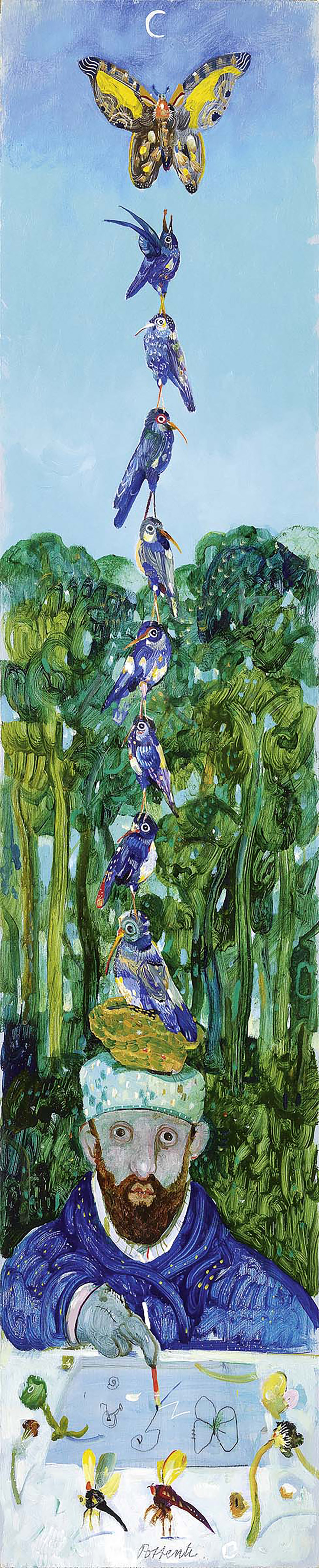 Antonio Possenti, Lucca 1933, Un pittore, 8 uccelli, 1 farfallone, 1 luna, 1995, Olio su tavola, cm. 100x20, Firma in basso al centro: Possenti; firma e titolo al verso: Possenti/Un$pittore/8$uccelli/1$farfallone/1/luna., Certificato su foto Archivio delle Opere del Maestro Antonio Possenti, con n. 460.,