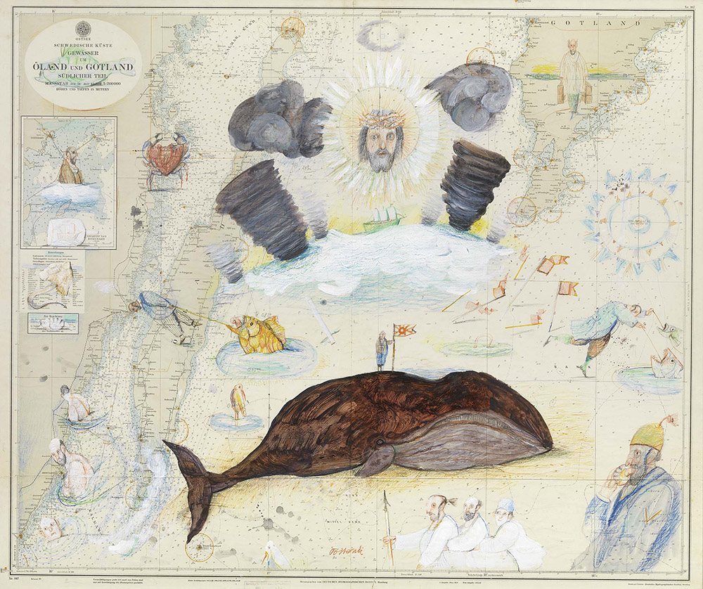 Antonio Possenti, Lucca 1933, Öland und Gotland, 1997, Tecnica mista su carta nautica, cm. 85x100, Firma in basso al centro: Possenti., Foto autenticata dall'artista con timbro Archivio delle Opere del Maestro Antonio Possenti, con n. 920.,