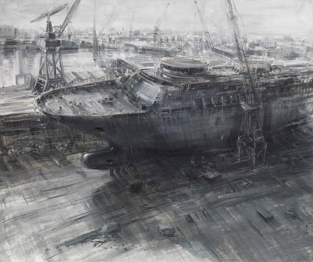 Alessandro Papetti, Milano 1958, Porto Marghera, 2004, Olio su tela, cm. 150x180, Firma in basso a destra: A. Papetti; titolo, data e firma al verso sulla tela: "Porto Marghera" 2004/Alessandro Papetti.,