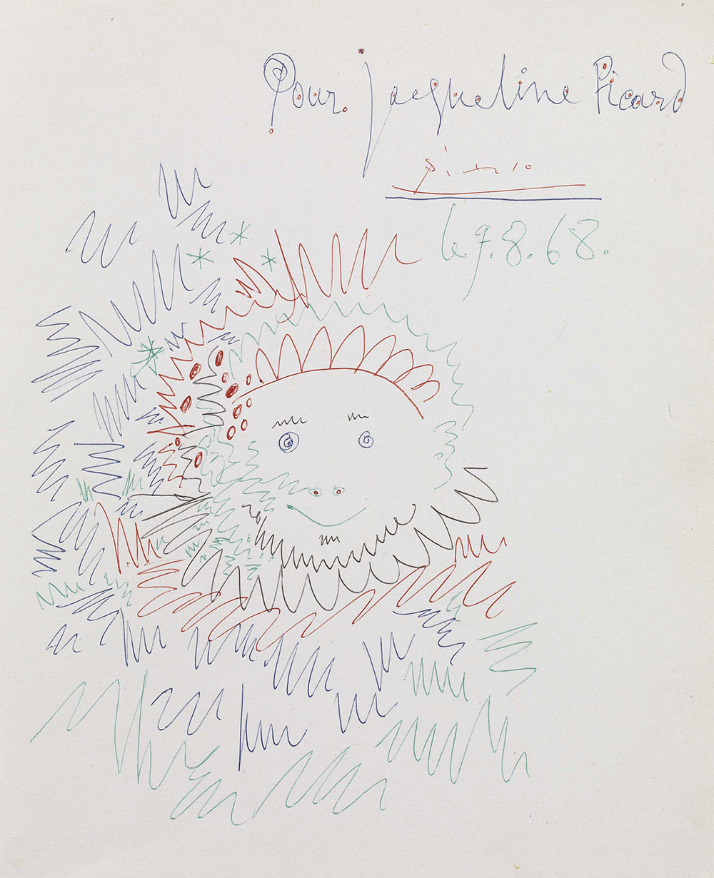 Pablo Picasso, Malaga 1881 - Mougins 1973, Soleil, 1968, Inchiostro biro su carta, cm. 28,9x23,4, Dedica, firma e data in alto a destra: Pour Jaqueline Picard$Picasso$le 7.8.68., Certificato su foto di Claude Picasso in data 30 ottobre 2007; parere orale favorevole di Maya Picasso., L'opera è realizzata sul frontespizio del volume Picasso - Théâtre, con un testo di Douglas Cooper, Éditions Cercle d'Art, Parigi, 1967.,