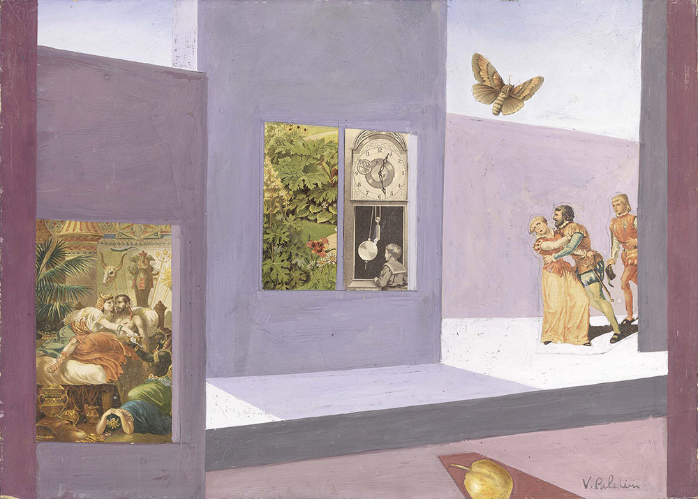 Vinicio Paladini, Mosca 1902 - Roma 1971, Senza titolo, (1920-25), Tempera e collage su cartone, cm. 41,5x58, Firma in basso a destra: V. Paladini. Al verso: etichetta Il Narciso Galleria d'Arte Contemporanea, Roma (opera datata 1920 ca.): etichetta e timbro Arte Centro, Milano, con n. 8781 (opera datata 1920)., Storia: Collezione privata, Roma; Collezione privata, Esposizioni: Futurismo 1909-1944, Roma, Palazzo delle Esposizioni, 7 luglio - 22 ottobre 2001, cat. p. 335, illustrata a colori (opera datata 1925 ca.).,