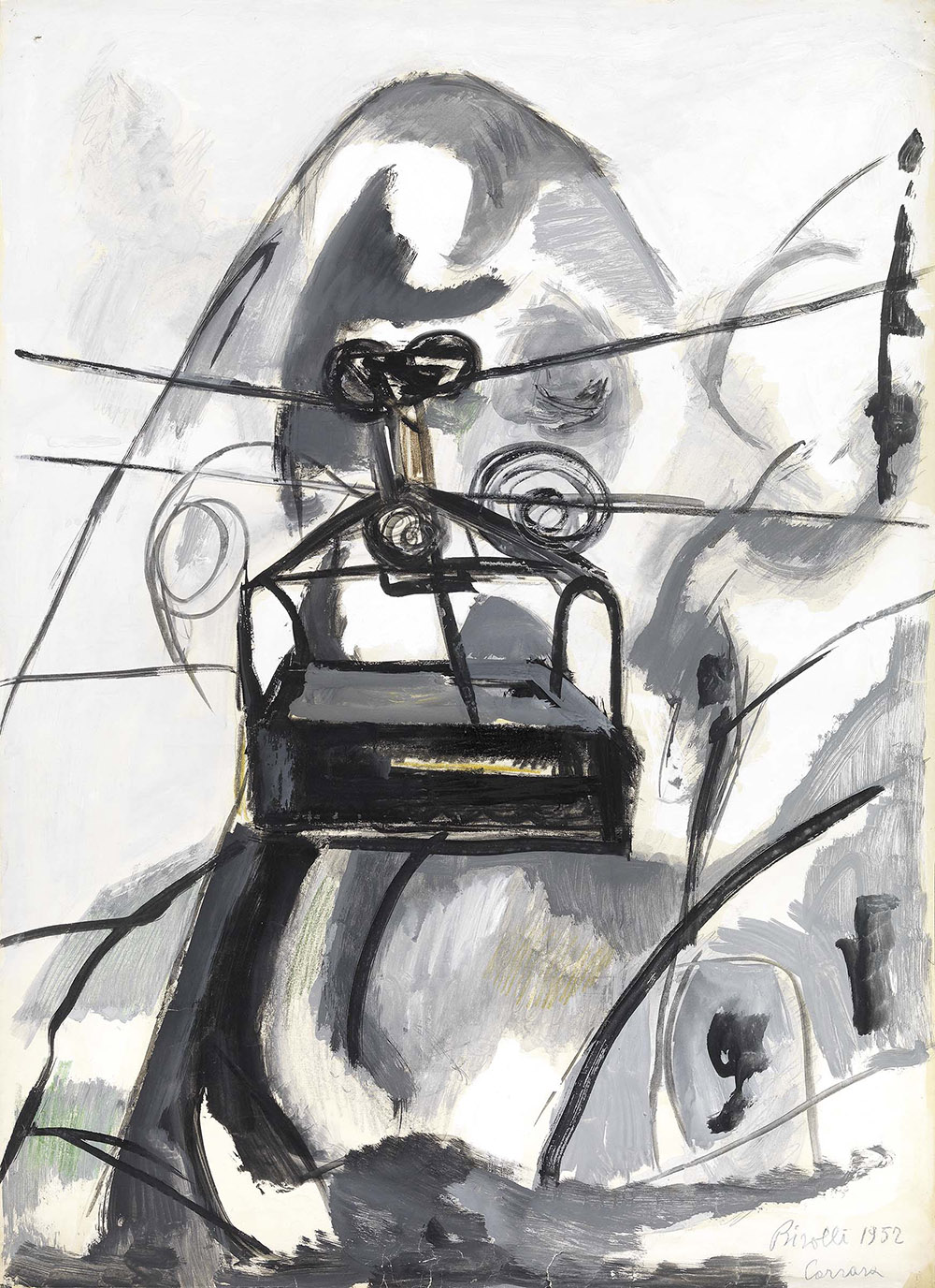 Renato Birolli, Verona 1905 - Milano 1959, Teleferica, 1952, Tempera su carta, cm. 70x50, Firma, data e luogo in basso a destra: Birolli 1952$Carrara. Al verso su un pannello di supporto: etichetta Casa del Mantegna$Mantova$4 novembre 2001 - 6 gennaio 2002$Renato Birolli$1943-1958.,